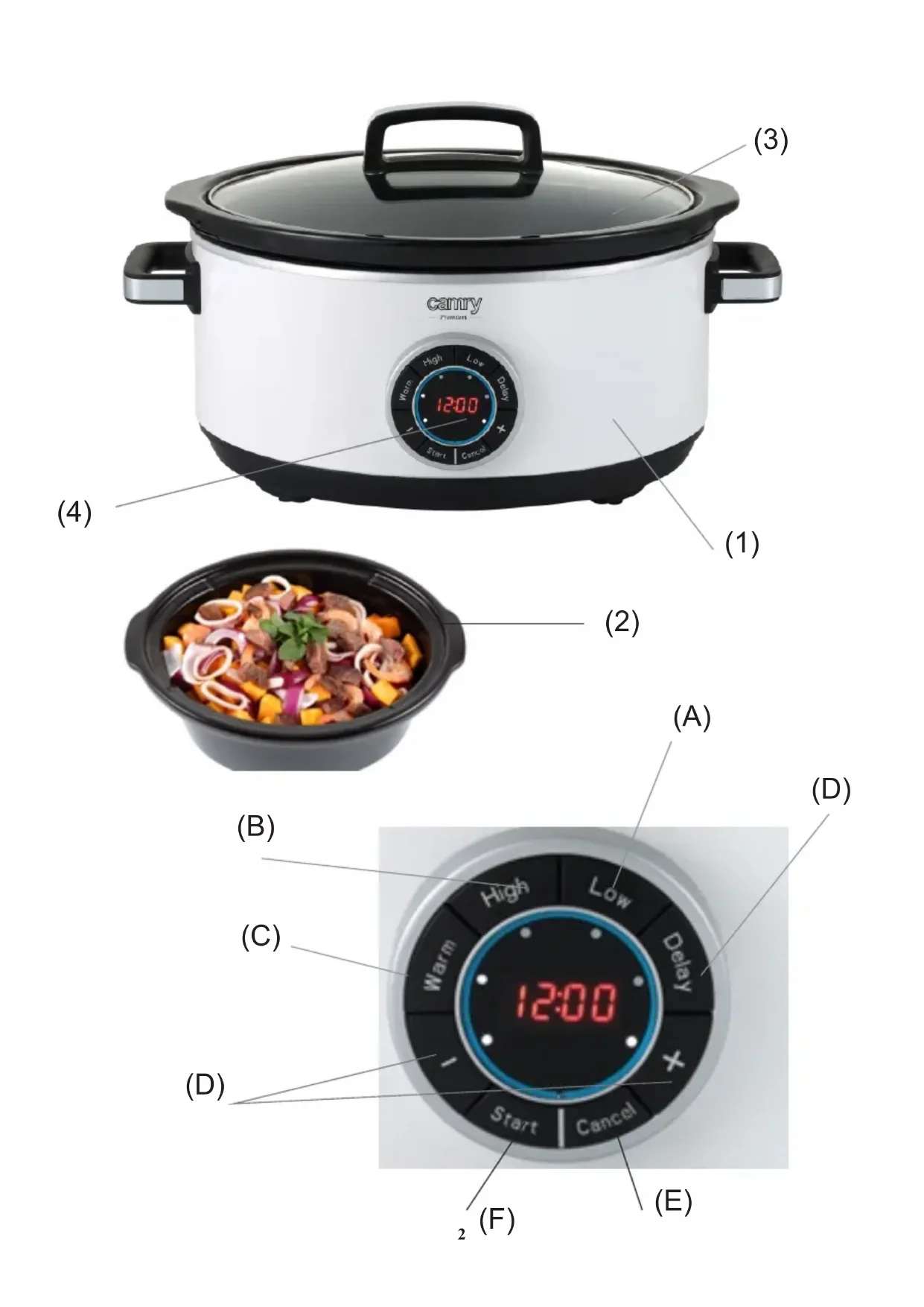FUNCTIONS: A: Low work defaulted time is 8 hours. You can choose cooking time from 30 minutes till 24 hours. B: High work defaulted time is 4H.You can choose cooking time from 30 minutes till 24 hours. C: Warm – means keep warm, defaulted time is 12 hours. You can choose cooking time from 30 minutes till 24 hours. D: press button “+”or “-” to increase or decrease the cooking time. Every increment is 30 minutes. You can adjust the cooking time at any cooking process. E: Delay – means delay start function. Choose delay time first and choose the function after. After setting, the unit will start automatically. The LED will show delay time first, after delay time finished, the LED will count down the cooking time instead. F: Cancel - press Cancel button to stop already selected cooking program.