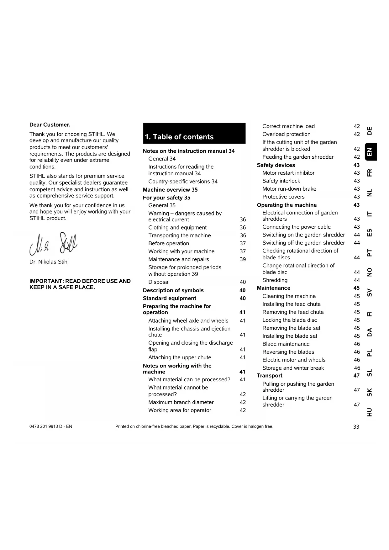 Notes on the instruction manual 34 General 34 Instructions for reading the instruction manual 34 Country-specific versions 34 Machine overview 35 For your safety 35 General 35 Warning – dangers caused by electrical current 36 Clothing and equipment 36 Transporting the machine 36 Before operation 37 Working with your machine 37 Maintenance and repairs 39 Storage for prolonged periods without operation 39 Disposal 40 Description of symbols 40 Standard equipment 40 Preparing the machine for operation 41 Attaching wheel axle and wheels 41 Installing the chassis and ejection chute 41 Opening and closing the discharge flap 41 Attaching the upper chute 41 Notes on working with the machine 41 What material can be processed? 41 What material cannot be processed? 42 Maximum branch diameter 42 Working area for operator 42 Correct machine load 42 Overload protection 42 If the cutting unit of the garden shredder is blocked 42 Feeding the garden shredder 42 Safety devices 43 Motor restart inhibitor 43 Safety interlock 43 Motor run-down brake 43 Protective covers 43 Operating the machine 43 Electrical connection of garden shredders 43 Connecting the power cable 43 Switching on the garden shredder 44 Switching off the garden shredder 44 Checking rotational direction of blade discs 44 Change rotational direction of blade disc 44 Shredding 44 Maintenance 45 Cleaning the machine 45 Installing the feed chute 45 Removing the feed chute 45 Locking the blade disc 45 Removing the blade set 45 Installing the blade set 45 Blade maintenance 46 Reversing the blades 46 Electric motor and wheels 46 Storage and winter break 46 Transport 47 Pulling or pushing the garden shredder 47 Lifting or carrying the garden shredder 470478 201 9913 D - EN
