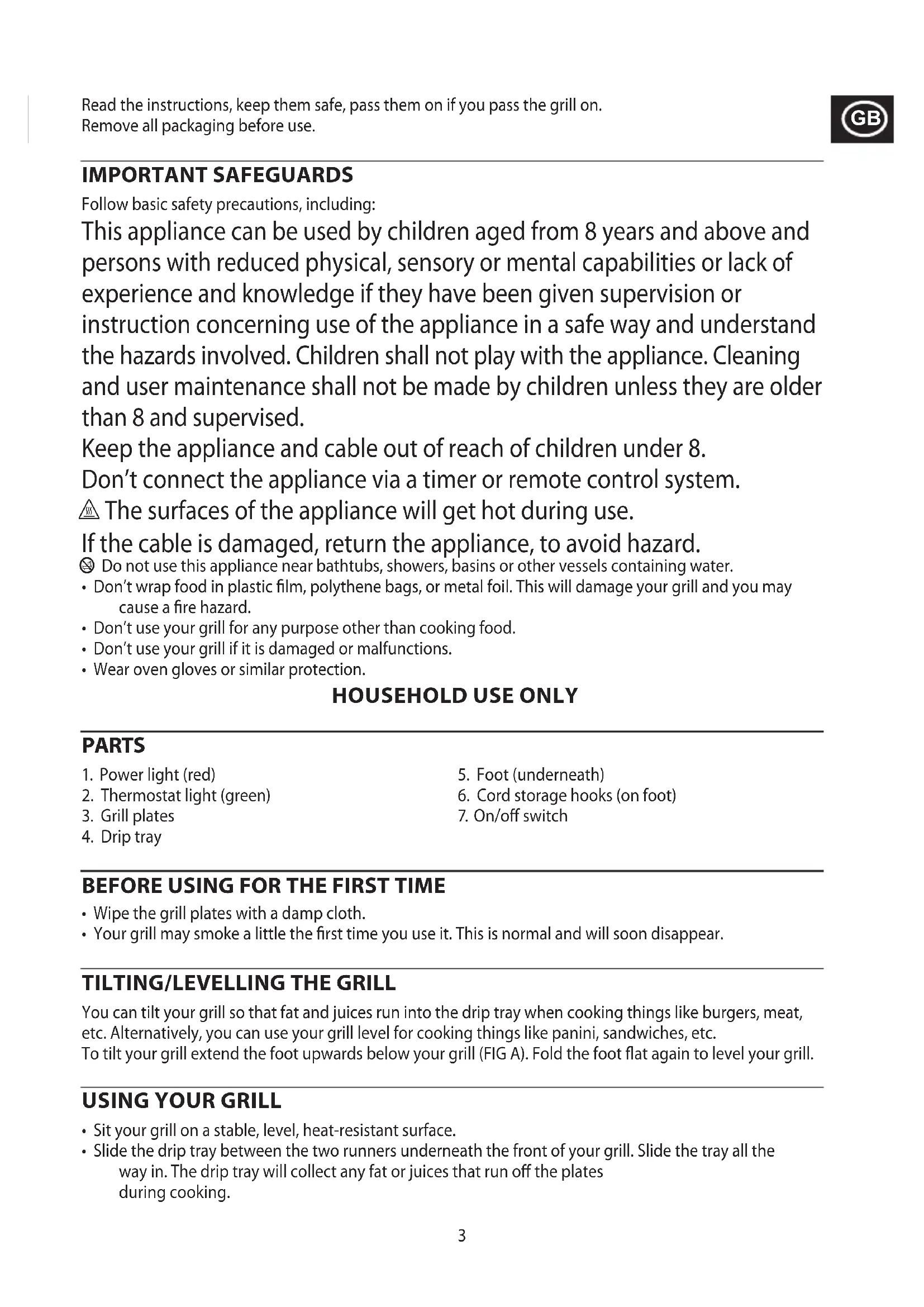 Read the instructions, keep them safe, pass them on if you pass the grill on. Remove all packaging before use. IMPORTANT SAFEGUARDS Follow basic safety precautions, including: This appliance can be used by children aged from 8 years and above and persons with reduced physical, sensory or mental capabilities or lack of experience and knowledge if they have been given supervision or instruction concerning use of the appliance in a safe way and understand the hazards involved. Children shall not play with the appliance. Cleaning and user maintenance shall not be made by children unless they are older than 8 and supervised. Keep the appliance and cable out of reach of children under 8. Don’t connect the appliance via a timer or remote control system. ¬ The surfaces of the appliance will get hot during use. If the cable is damaged, return the appliance, to avoid hazard. b Do not use this appliance near bathtubs, showers, basins or other vessels containing water.
