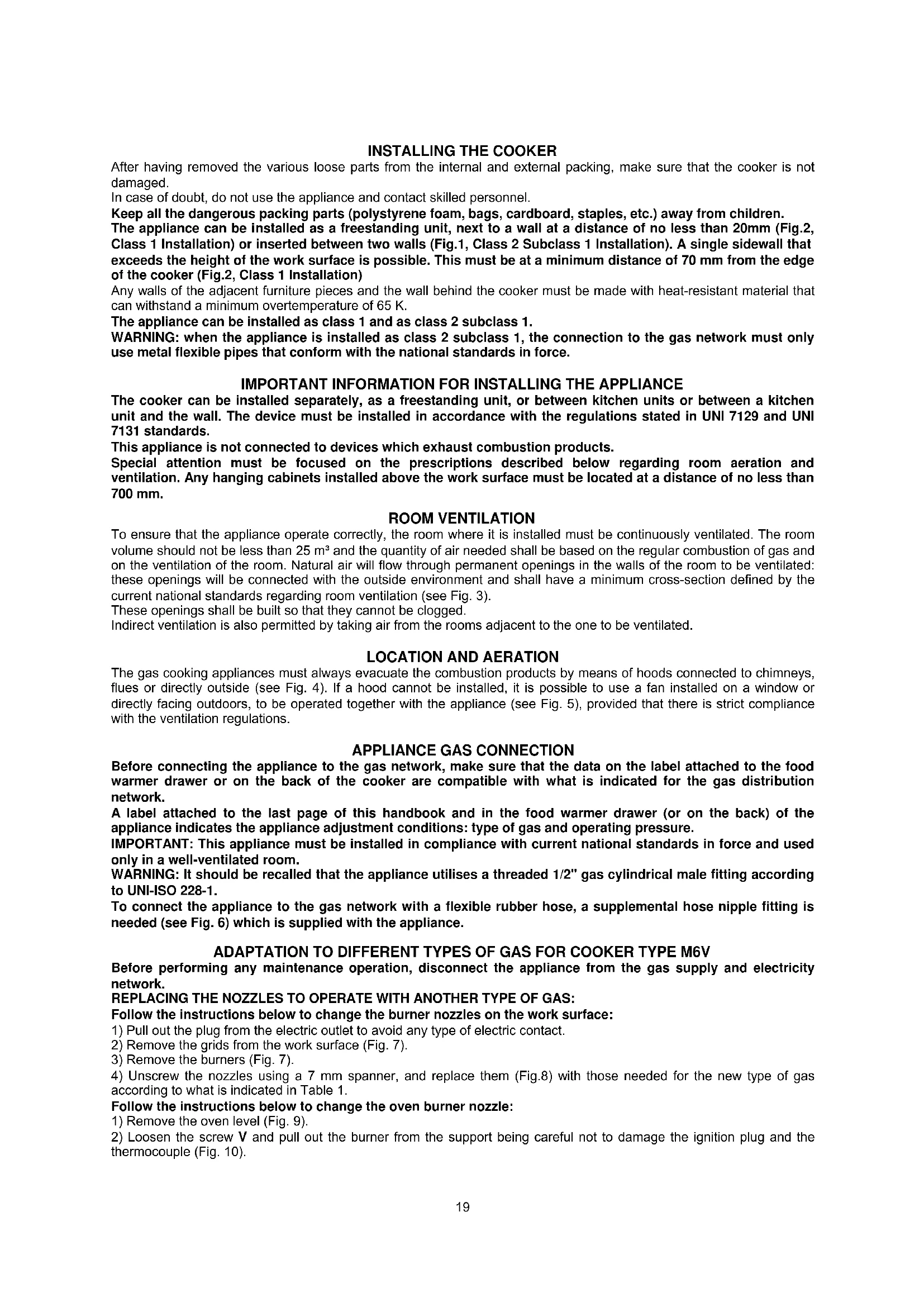 to UNI-ISO 228-1. To connect the appliance to the gas network with a flexible rubber hose, a supplemental hose nipple fitting is needed (see Fig. 6) which is supplied with the appliance. ADAPTATION TO DIFFERENT TYPES OF GAS FOR COOKER TYPE M6V Before performing any maintenance operation, disconnect the appliance from the gas supply and electricity network. REPLACING THE NOZZLES TO OPERATE WITH ANOTHER TYPE OF GAS: Follow the instructions below to change the burner nozzles on the work surface: