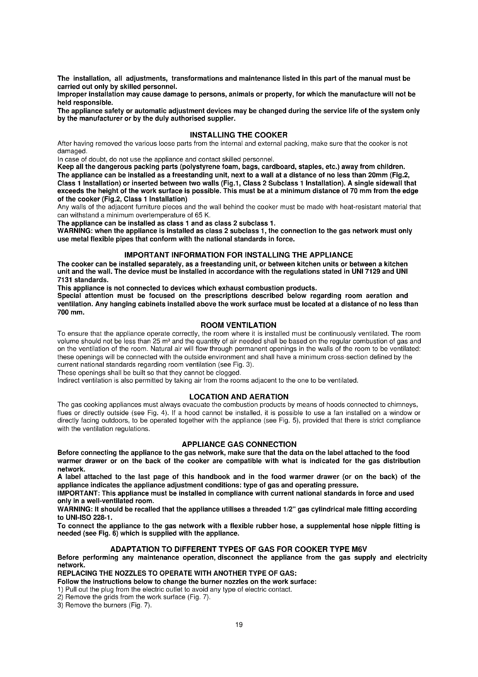 to UNI-ISO 228-1. To connect the appliance to the gas network with a flexible rubber hose, a supplemental hose nipple fitting is needed (see Fig. 6) which is supplied with the appliance. ADAPTATION TO DIFFERENT TYPES OF GAS FOR COOKER TYPE M6V Before performing any maintenance operation, disconnect the appliance from the gas supply and electricity network. REPLACING THE NOZZLES TO OPERATE WITH ANOTHER TYPE OF GAS: Follow the instructions below to change the burner nozzles on the work surface: