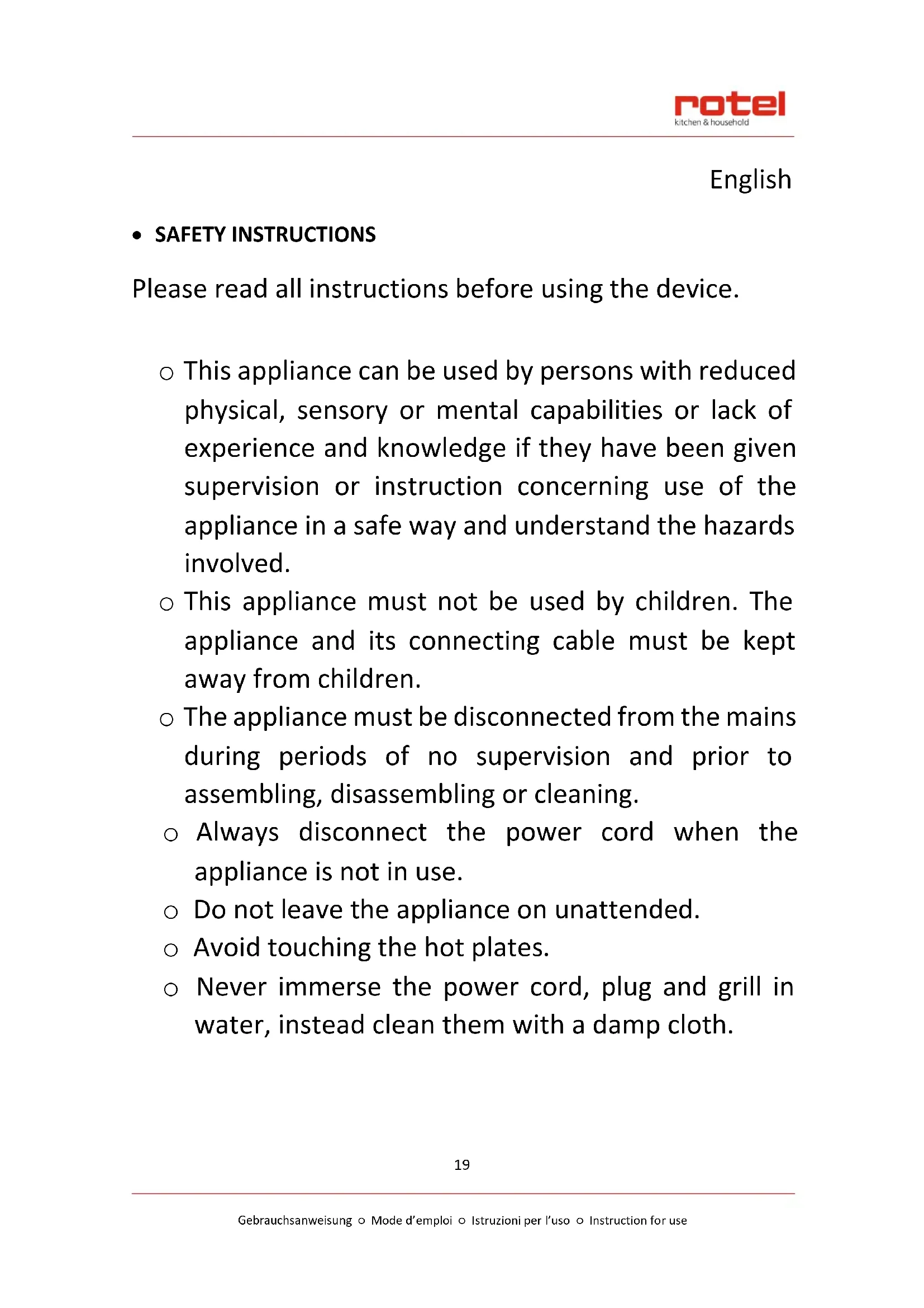 - SAFETY INSTRUCTIONS Please read all instructions before using the device. o This appliance can be used by persons with reduced physical, sensory or mental capabilities or lack of experience and knowledge if they have been given supervision or instruction concerning use of the appliance in a safe way and understand the hazards involved. o This appliance must not be used by children. The appliance and its connecting cable must be kept away from children. o The appliance must be disconnected from the mains during periods of no supervision and prior to assembling, disassembling or cleaning. o Always disconnect the power cord when the appliance is not in use. o Do not leave the appliance on unattended. o Avoid touching the hot plates. o Never immerse the power cord, plug and grill in water, instead clean them with a damp cloth.Gebrauchsanweisung ○ Mode d’emploi ○ Istruzioni per l’uso ○ Instruction for use
