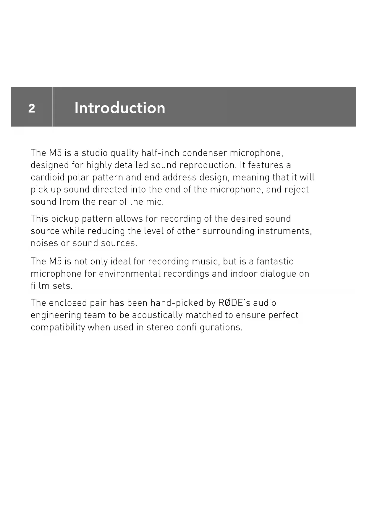 ENGLISHINSTRUCTION MANUAL Compact 1/2” Cardioid Condenser Microphones M5_multilingual_manual.indb 1M5_multilingual_manual.indb 1 2/09/2013 6:59:47 PM2/09/2013 6:59:47 PM2 The M5 is a studio quality half-inch condenser microphone, designed for highly detailed sound reproduction. It features a cardioid polar pattern and end address design, meaning that it will pick up sound directed into the end of the microphone, and reject sound from the rear of the mic. This pickup pattern allows for recording of the desired sound source while reducing the level of other surrounding instruments, noises or sound sources. The M5 is not only ideal for recording music, but is a fantastic microphone for environmental recordings and indoor dialogue on fi lm sets. The enclosed pair has been hand-picked by RØDE’s audio engineering team to be acoustically matched to ensure perfect compatibility when used in stereo confi gurations. Introduction M5_multilingual_manual.indb 2M5_multilingual_manual.indb 2 2/09/2013 7:00:05 PM2/09/2013 7:00:05 PM3 Features