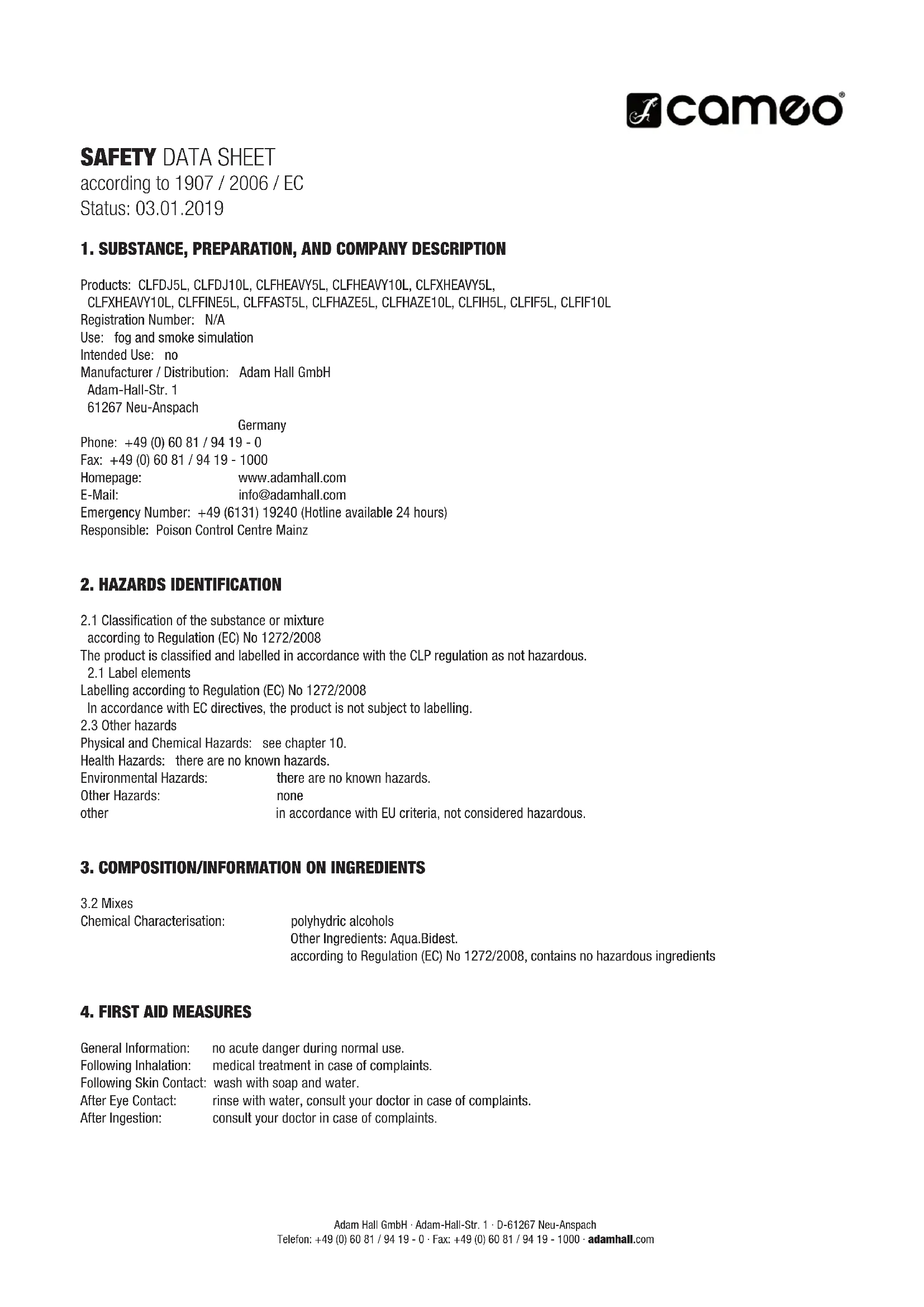 Department Issuing Data Sheet: QM Contact Person: Mr Michael Rösch Exposure Scenario: professional fog fluid for the production of short-term, artificial fog and show effects for the event industry, theatre and film production. Taking into account the visibility and the desired effect, the fog fluid concentration in the air should be dosed between 25 and maximum of 80 mg/m3. In particular, the fog density to be dosed in such a way that exits and emergency exits in enclosed spaces always remain visible. The same applies to the lighting of escape routes, their markings, stair exits, shafts, drop-off edges, etc. Visibility of 25 m (according to VStattV max. distance to the next exit) must be complied with. With regard to the prevention of anxiety, fogged rooms should never be sealed. The product is to be used properly and as delivered. Keep out of reach of children. This information is based on our present state of knowledge and experience. The safety data sheet describes products with respect to safety requirements. The data does not claim product properties in terms of quality descriptions.Adam Hall GmbH · Adam-Hall-Str. 1 · D-61267 Neu-Anspach Telefon: +49 (0) 60 81 / 94 19 - 0 · Fax: +49 (0) 60 81 / 94 19 - 1000 · adamhall.com SICHERHEITSDATENBLATT gemäß 1907 / 2006 / EG Stand: 03.01.2019
