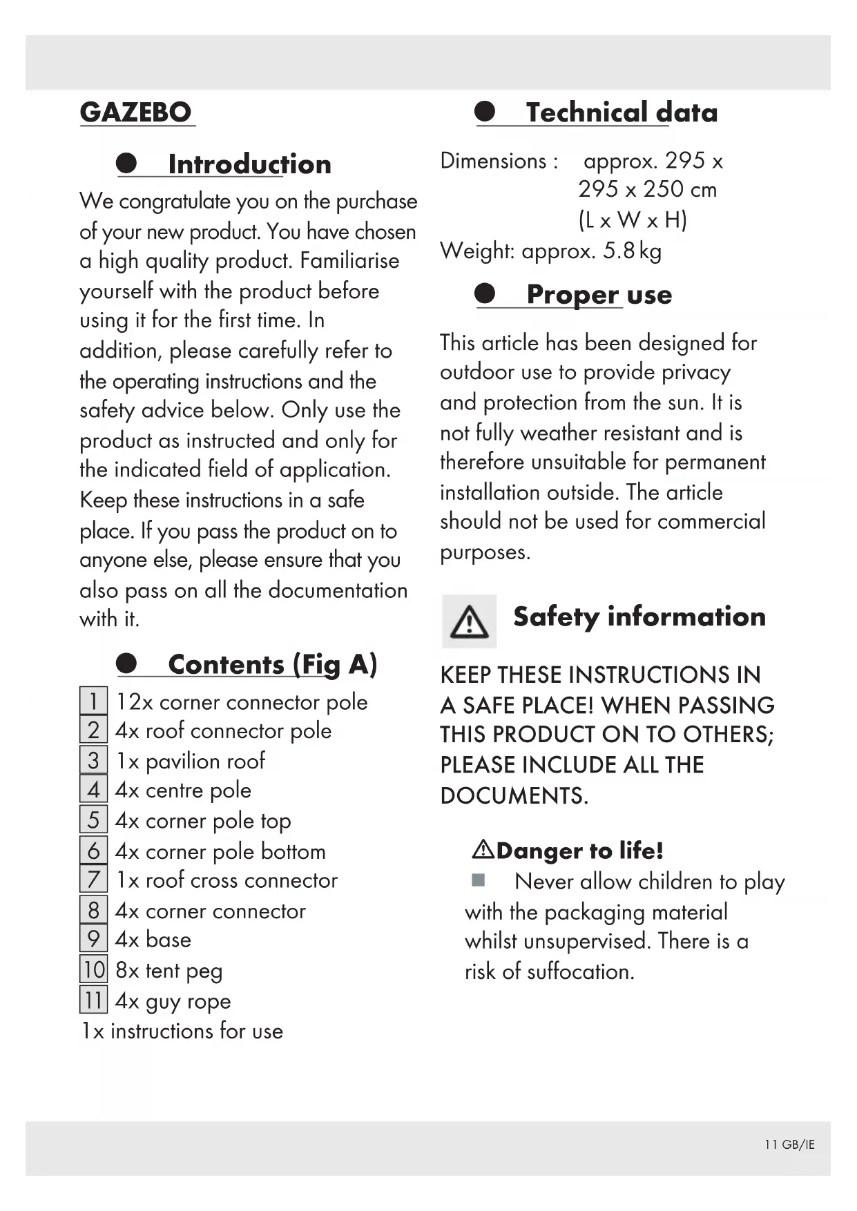 DOCUMENTS. mDanger to life! Never allow children to play with the packaging material whilst unsupervised. There is a risk of suffocation.12 GB/IE mDanger of injury! The article must not be used in adverse weather conditions such as strong wind or heavy rain and snow. Dismantle the pavilion if wind speeds are expected to exceed 40 km/h (brisk and clearly audible winds, larger branches and trees moving). Disassemble the article if the wind begins to rise or if other adverse weather conditions occur. Take particular care to avoid squashing your fingers whilst erecting and dismantling the article. This could cause injury in the form of contusions. Place the article on a level surface. Indicate the presence of the guy rope to other persons and warn them of the danger of tripping. Make sure that the article is fully stretched out prior to use. The article may only be used under the supervision of adults and is not designed as a toy. Check the article for damage or wear and tear prior to each use. Check that all elements have been properly installed before using the article. Incorrect assembly may reduce safety and functionality. Do not use open fires, grills or patio heaters in or near the article. Leave the pavilion immediately in the event that it catches fire! Use a fire extinguisher or water to put out the blaze. Alert the fire brigade without delay if necessary. Individual pavilions must not be connected or fixed to one another. A minimum distance of 3 metres must be maintained between individual pavilions. Any build-up’s of water must be removed! The guy ropes must be used at their full length.13 GB/IE Choice of location The dimensions of the article are 3 x 3 m, and additional space will be required for the guy ropes. Wherever possible, place the article in an area where it is protected from the wind. The ground should be level and should provide the tent pegs with sufficient stability. Assembly Note! At least 2 persons are needed to erect the article. We recommend that assembly should be carried out by 4 persons. Step 1 (Fig B) Assemble the roof frame. Connect each of the centre poles [4] with two corner connector poles [1] and a corner connector [8]. Please make sure that the locking mechanisms [1] click into place both visibly and audibly in the holes in the corner connector. mWarning! Risk of trapping hands or fingers! Step 2 (Fig C) Insert the last four corner connector poles into the corner connector. Insert the four roof connector poles [2] and connect these to the roof cross connector [7]. Please make sure that the locking mechanisms [1] click into place both visibly and audibly in the holes in the corner connector. mWarning! Risk of trapping hands or fingers! Step 3 (Fig D) Insert the top corner poles [5] into the corner connector [8]. Step 4 (Fig E) Pull the pavilion roof [3] over the frame. Fix the roof into place using the pre-installed velcro fasteners [] on the roof frame. Step 5 (Fig F) Insert the bottom corner poles [6] into the top corner poles and the bases [9]. Fasten the roof loops [] into one of the drilled holes in the bottom corner pole.14 GB/IE Step 6 (Fig G) Anchor each foot with the help of the tent pegs []. Use the openings in the feet for this purpose. Knot one end of each guy rope [] to a roof loop [] at the outer corners of the product. mWarning! Extend the guy ropes to their full length in order to achieve a high level of stability and attach the ends using one tent peg each. mWarning! Make sure the tent pegs are fixed securely. Disassembly Step 1 Loosen the tent pegs holding the guy ropes and bases. Step 2 Release the roof loops from the bottom corner poles. Remove the bases and bottom corner poles. Step 3 Remove the roof and top corner poles. Step 4 Disassemble the roof frame. Press on the locking mechanism to release the poles from the corner connectors. mWarning! Risk of trapping hands or fingers! Step 5 Make sure that the article is clean and dry prior to storage. Cleaning and care Clean the article using a damp cloth and a mild detergent. Do not use petrol, solvents or strong detergents. Storage In order to be able to enjoy the article for as long as possible, we recommend that it should always be stored in a dry and clean condition at room temperature when not in use.15 GB/IE Disposal The packaging is made entirely of recyclable materials, which you may dispose of at local recycling facilities. Contact your local refuse disposal authority for more details of how to dispose of your worn-out product. Warranty The product has been manufactured to strict quality guidelines and meticulously examined before delivery. In the event of product defects you have legal rights against the retailer of this product. Your legal rights are not limited in any way by our warranty detailed below. The warranty for this product is 3 years from the date of purchase. The warranty period begins on the date of purchase. Please keep the original sales receipt in a safe location. This document is required as your proof of purchase. Should this product show any fault in materials or manufacture within 3 years from the date of purchase, we will repair or replace it – at our choice – free of charge to you. This warranty becomes void if the product has been damaged, or used or maintained improperly. The warranty applies to defects in material or manufacture. This warranty does not cover product parts subject to normal wear, thus possibly considered consumables (e.g. batteries) or for damage to fragile parts, e.g. switches, rechargeable batteries or glass parts. Warranty claim procedure To ensure quick processing of your case, please observe the following instructions: Please have the till receipt and the item number (IAN 364728_2107) available as proof of purchase.16 GB/IE You will find the item number on the rating plate, an engraving, on the front page of the instructions for use (bottom left), or as a sticker on the rear or bottom of the product. If functional or other de