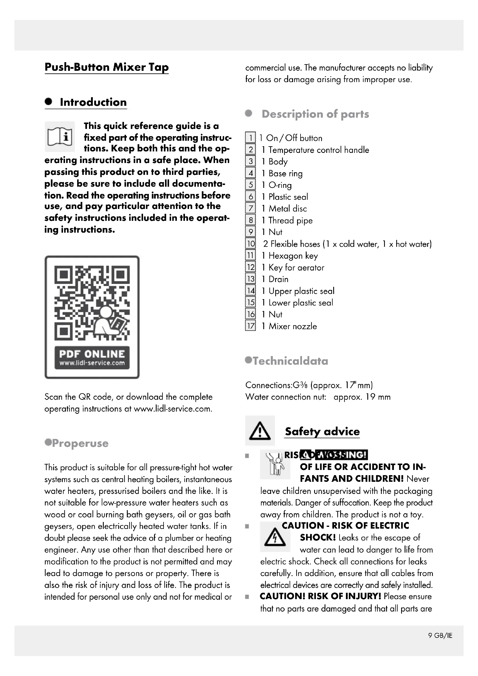 ion. Read the operating instructions bef ore use, and pay particular attention to the safety instructions included in the operat- ing instructions. Scan the QR code, or download the complete operating instructions at www.lidl-service.com. Proper use This product is suitable for all pressure-tight hot water systems such as central heating boilers, instantaneous water heaters, pressurised boilers and the like. It is not suitable for low-pressure water heaters such as wood or coal burning bath geysers, oil or gas bath geysers, open electrically heated water tanks. If in doubt please seek the advice of a plumber or heating engineer. Any use other than that described here or modification to the product is not permitted and may lead to damage to persons or property. There is also the risk of injury and loss of life. The product is intended for personal use only and not for medical or commercial use. The manufacturer accepts no liability for loss or damage arising from improper use. Description of parts