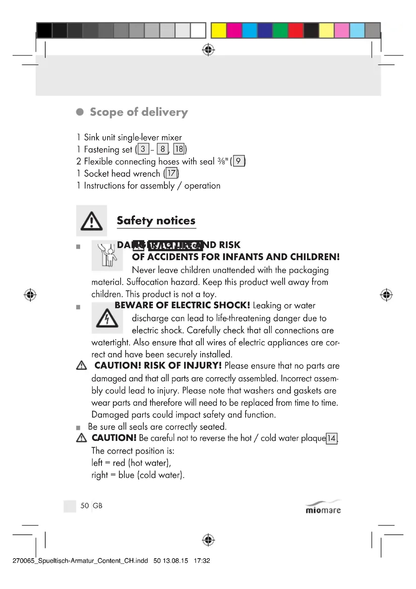 The correct position is: left = red (hot water), right = blue (cold water). 270065_Spueltisch-Armatur_Content_CH.indd 50 13.08.15 17:3251 GB CAUTION! DAMAGE TO THE ARTICLE! Please have all instal- lations performed by skilled individuals. Please note that the seals are wear parts and must be changed from time to time. Any leakage or sudden escape of water can cause considerable damage to buildings and property. All connections must therefore be checked carefully to ensure that they are tight. Familiarise yourself prior to installation with all local conditions, e.g. water connections and shut-off device. The product is only suitable for use in rooms in which a temperature above 0 °C is maintained. Installation Note: Familiarise yourself with the product prior to assembly. Carefully read the following assembly instructions and safety advice. In the event of incorrect installation, all warranty claims – particularly in relation to subsequent damage – are excluded. CAUTION! Before you start installation turn off the water supply at the mains. Otherwise injuries and / or property damage may occur. CAUTION! Do not twist or strain the connection hoses