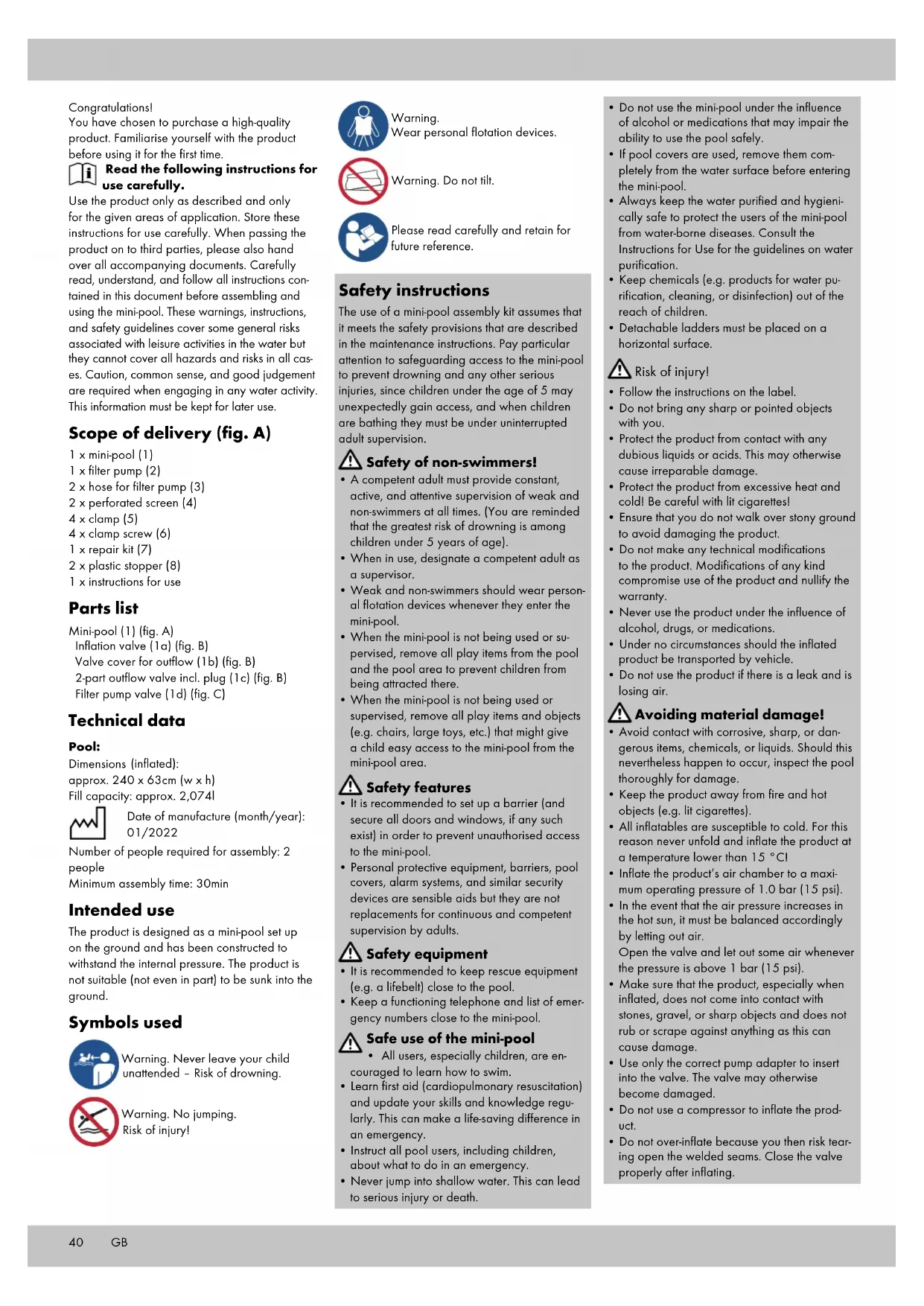 - Rivolgersi ad uno specialista. Smaltimento Una volta che l’articolo diventa inutilizzabile, non gettarlo nei rifiuti domestici, ma smaltirlo correttamente nel pieno rispetto dell’ambiente. È possibile ottenere informazioni sui punti di raccolta e sui loro orari di apertura presso l’ufficio amministra- tivo competente. Smaltire l’articolo e il materiale di imballaggio nel pieno rispetto dell’am- biente. Si noti la marcatura dei materiali di imballaggio durante la separazione dei rifiuti, questi sono contrassegnati da abbreviazioni (a) e numeri (b) con il seguente significato: 1-7: materiali plastici/20-22: carta e cartone/80-98: materiali compositi. L’articolo e i materiali di imballaggio sono rici- clabili, smaltirli separatamente per una migliore gestione dei rifiuti. Il logo Triman è valido solo per la Francia. Per informazioni su come smaltire l’articolo non più utilizzabile, rivolgersi alle autorità locali o comunali.40 Congratulations! You have chosen to purchase a high-quality product. Familiarise yourself with the product before using it for the first time. Read the following instructions for use carefully. Use the product only as described and only for the given areas of application. Store these instructions for use carefully. When passing the product on to third parties, please also hand over all accompanying documents. Carefully read, understand, and follow all instructions con- tained in this document before assembling and using the mini-pool. These warnings, instructions, and safety guidelines cover some general risks associated with leisure activities in the water but they cannot cover all hazards and risks in all cas- es. Caution, common sense, and good judgement are required when engaging in any water activity. This information must be kept for later use. Scope of delivery (fig. A) 1 x mini-pool (1) 1 x filter pump (2) 2 x hose for filter pump (3) 2 x perforated screen (4) 4 x clamp (5) 4 x clamp screw (6) 1 x repair kit (7) 2 x plastic stopper (8) 1 x instructions for use Parts list Mini-pool (1) (fig. A) Inflation valve (1a) (fig. B) Valve cover for outflow (1b) (fig. B) 2-part outflow valve incl. plug (1c) (fig. B) Filter pump valve (1d) (fig. C) Technical data Pool: Dimensions (inflated): approx. 240 x 63cm (w x h) Fill capacity: approx. 2,074l Date of manufacture (month/year): 01/2022 Number of people required for assembly: 2 people Minimum assembly time: 30min Intended use The product is designed as a mini-pool set up on the ground and has been constructed to withstand the internal pressure. The product is not suitable (not even in part) to be sunk into the ground. Symbols used Warning. Never leave your child unattended – Risk of drowning. Warning. No jumping. Risk of injury! Warning. Wear personal flotation devices. Warning. Do not tilt. Please read carefully and retain for future reference. Safety instructions The use of a mini-pool assembly kit assumes that it meets the safety provisions that are described in the maintenance instructions. Pay particular attention to safeguarding access to the mini-pool to prevent drowning and any other serious injuries, since children under the age of 5 may unexpectedly gain access, and when children are bathing they must be under uninterrupted adult supervision. Safety of non-swimmers!