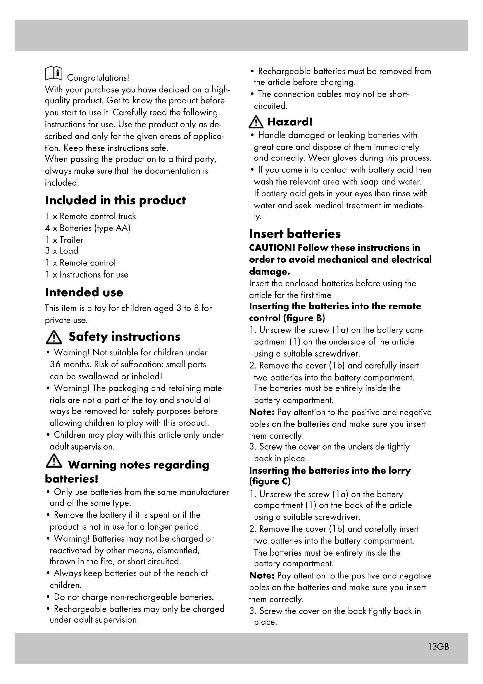 lato inferiore della confezione.13GB Congratulations! With your purchase you have decided on a high- quality product. Get to know the product before you start to use it. Carefully read the following instructions for use. Use the product only as de- scribed and only for the given areas of applica- tion. Keep these instructions safe. When passing the product on to a third party, always make sure that the documentation is included. Included in this product 1 x Remote control truck 4 x Batteries (type AA) 1 x Trailer 3 x Load 1 x Remote control 1 x Instructions for use Intended use This item is a toy for children aged 3 to 8 for private use. Safety instructions
