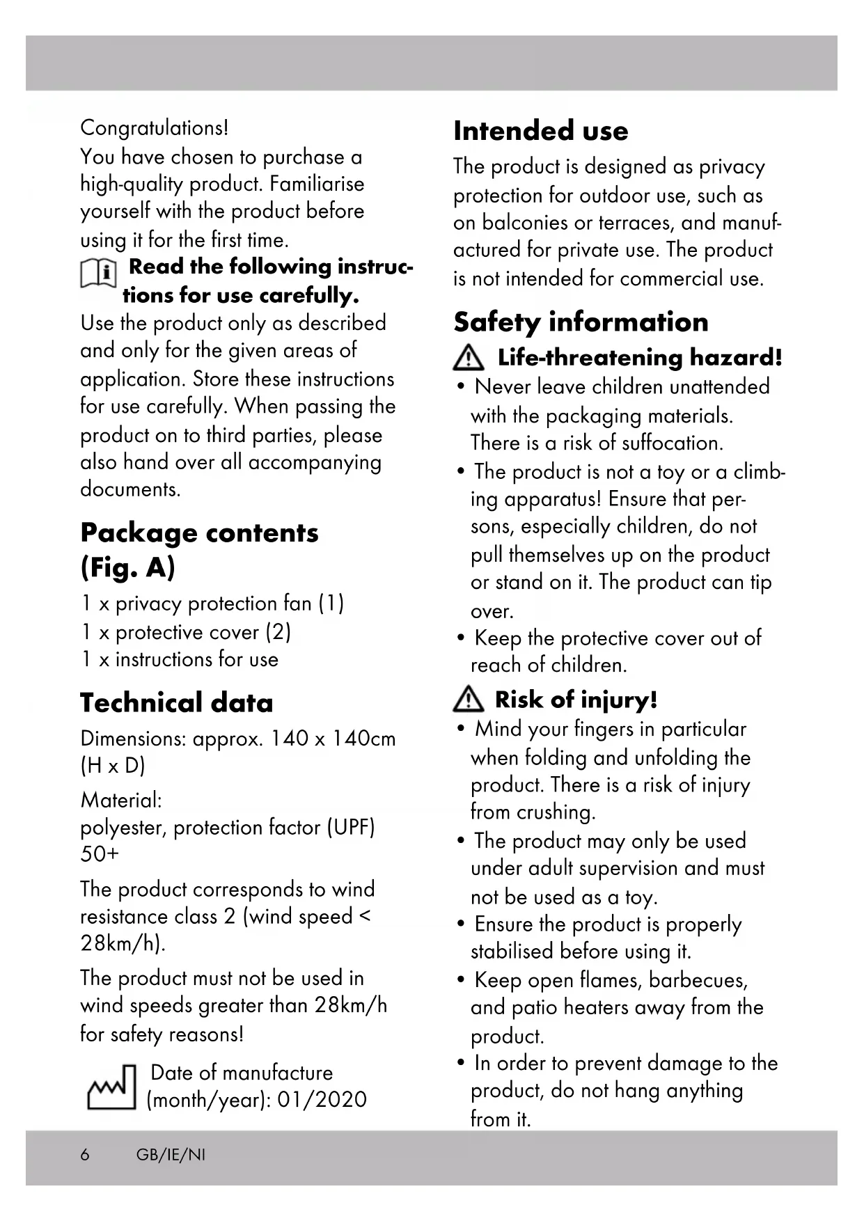 Congratulations! You have chosen to purchase a high-quality product. Familiarise yourself with the product before using it for the first time. Read the following instruc- tions for use carefully. Use the product only as described and only for the given areas of application. Store these instructions for use carefully. When passing the product on to third parties, please also hand over all accompanying documents. Package contents (Fig. A) 1 x privacy protection fan (1) 1 x protective cover (2) 1 x instructions for use Technical data Dimensions: approx. 140 x 140cm (H x D) Material: polyester, protection factor (UPF) 50+ The product corresponds to wind resistance class 2 (wind speed < 28km/h). The product must not be used in wind speeds greater than 28km/h for safety reasons! Date of manufacture (month/year): 01/2020 Intended use The product is designed as privacy protection for outdoor use, such as on balconies or terraces, and manuf- actured for private use. The product is not intended for commercial use. Safety information Life-threatening hazard!