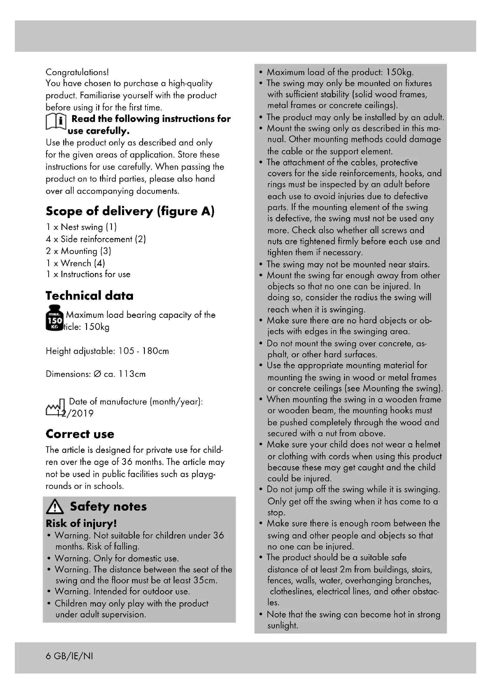 - Note that the swing can become hot in strong sunlight. Congratulations! You have chosen to purchase a high-quality product. Familiarise yourself with the product before using it for the first time. Read the following instructions for use carefully. Use the product only as described and only for the given areas of application. Store these instructions for use carefully. When passing the product on to third parties, please also hand over all accompanying documents. Scope of delivery (figure A) 1 x Nest swing (1) 4 x Side reinforcement (2) 2 x Mounting (3) 1 x Wrench (4) 1 x Instructions for use Technical data Maximum load bearing capacity of the article: 150kg Height adjustable: 105 - 180cm Dimensions: Ø ca. 113cm Date of manufacture (month/year): 12/2019 Correct use The article is designed for private use for child- ren over the age of 36 months. The article may not be used in public facilities such as playg- rounds or in schools. Safety notes Risk of injury!