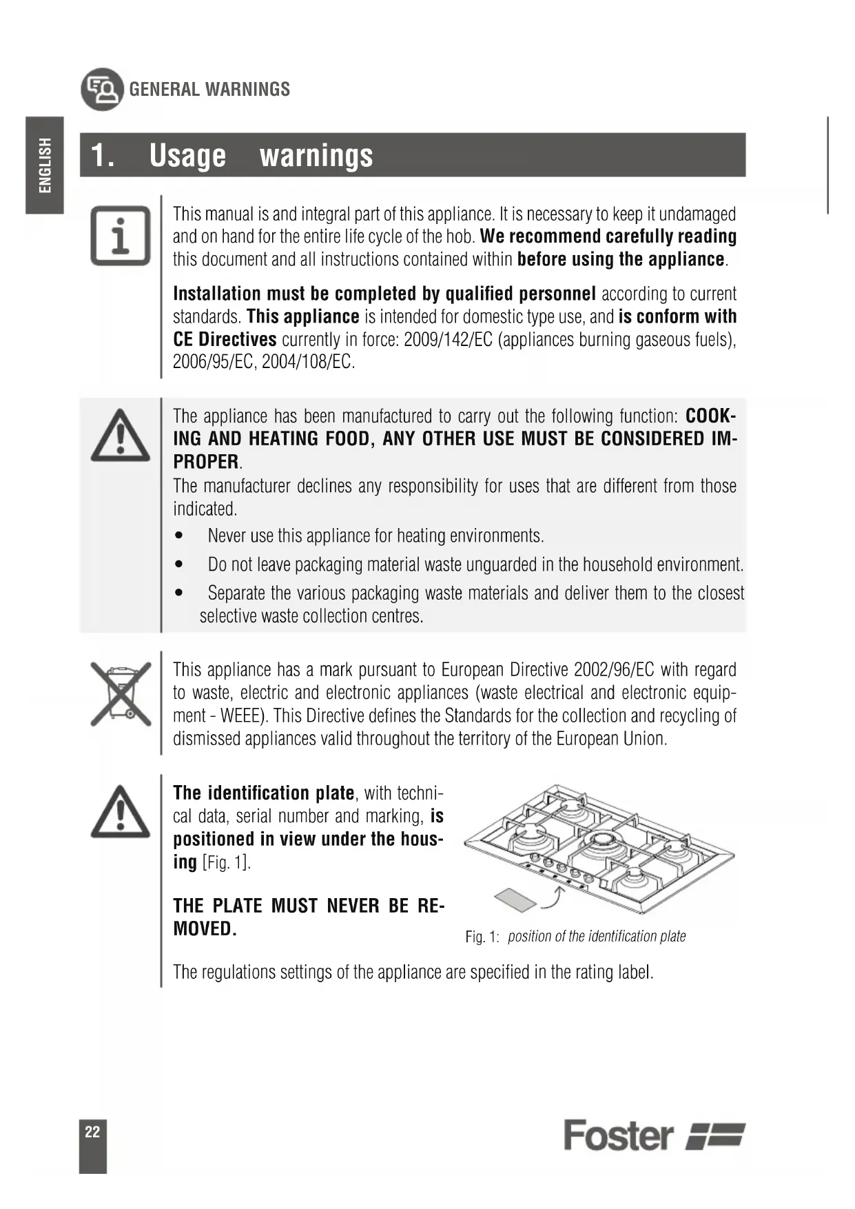 This manual is and integral part of this appliance. It is necessary to keep it undamaged and on hand for the entire life cycle of the hob. We recommend carefully reading this document and all instructions contained within before using the appliance. Installation must be completed by qualified personnel according to current standards. This appliance is intended for domestic type use, and is conform with CE Directives currently in force: 2009/142/EC (appliances burning gaseous fuels), 2006/95/EC, 2004/108/EC. The appliance has been manufactured to carry out the following function: COOK- ING AND HEATING FOOD, ANY OTHER USE MUST BE CONSIDERED IM- PROPER. The manufacturer declines any responsibility for uses that are different from those indicated. t Never use this appliance for heating environments. t Do not leave packaging material waste unguarded in the household environment. t Separate the various packaging waste materials and deliver them to the closest selective waste collection centres. This appliance has a mark pursuant to European Directive 2002/96/EC with regard to waste, electric and electronic appliances (waste electrical and electronic equip- ment - WEEE). This Directive defines the Standards for the collection and recycling of dismissed appliances valid throughout the territory of the European Union. The identification plate, with techni- cal data, serial number and marking, is positioned in view under the hous- ing [Fig. 1].