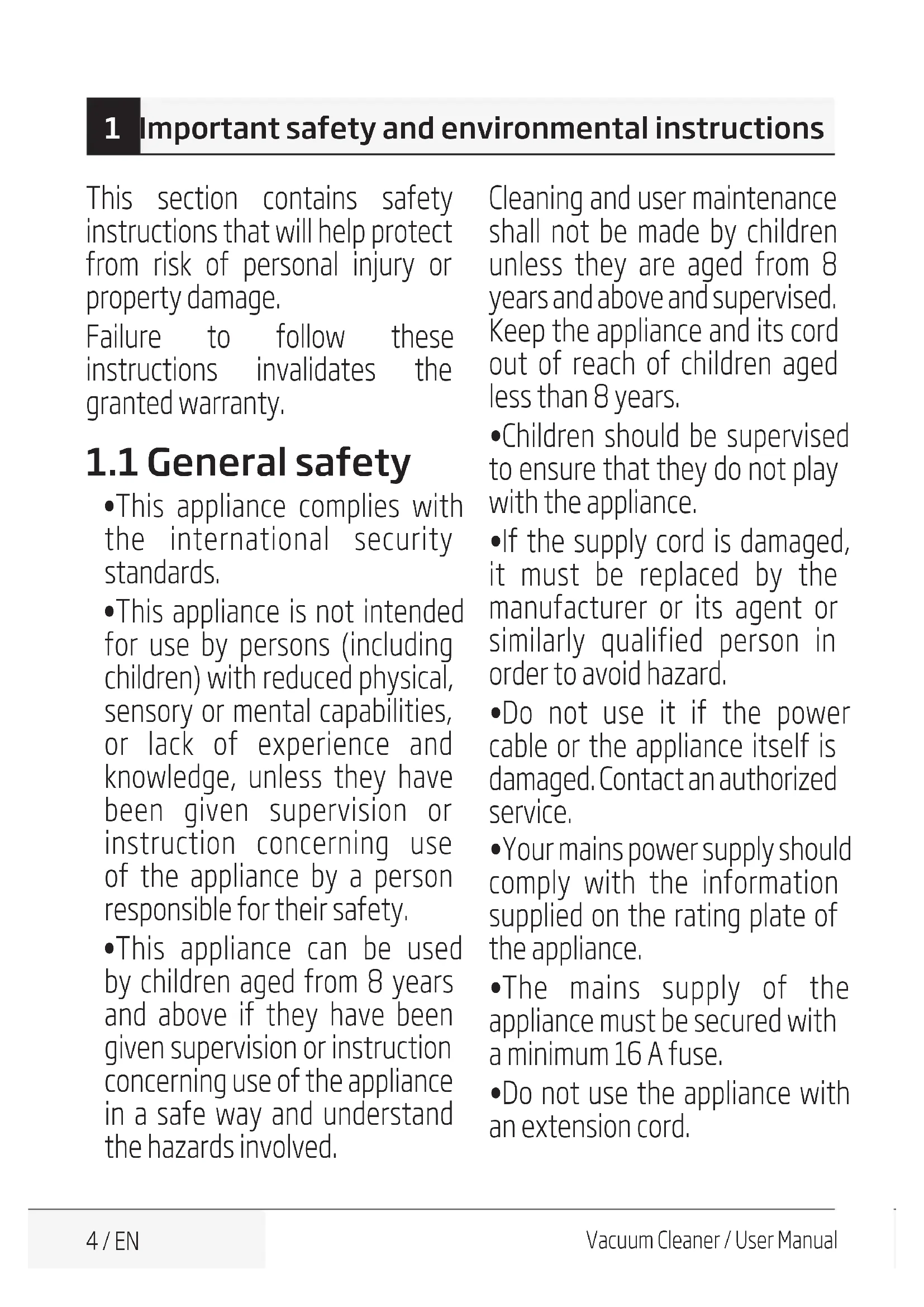 - Do not use the appliance with an extension cord.Vacuum Cleaner / User Manual 5 / EN 1 Important safety and environmental instructions