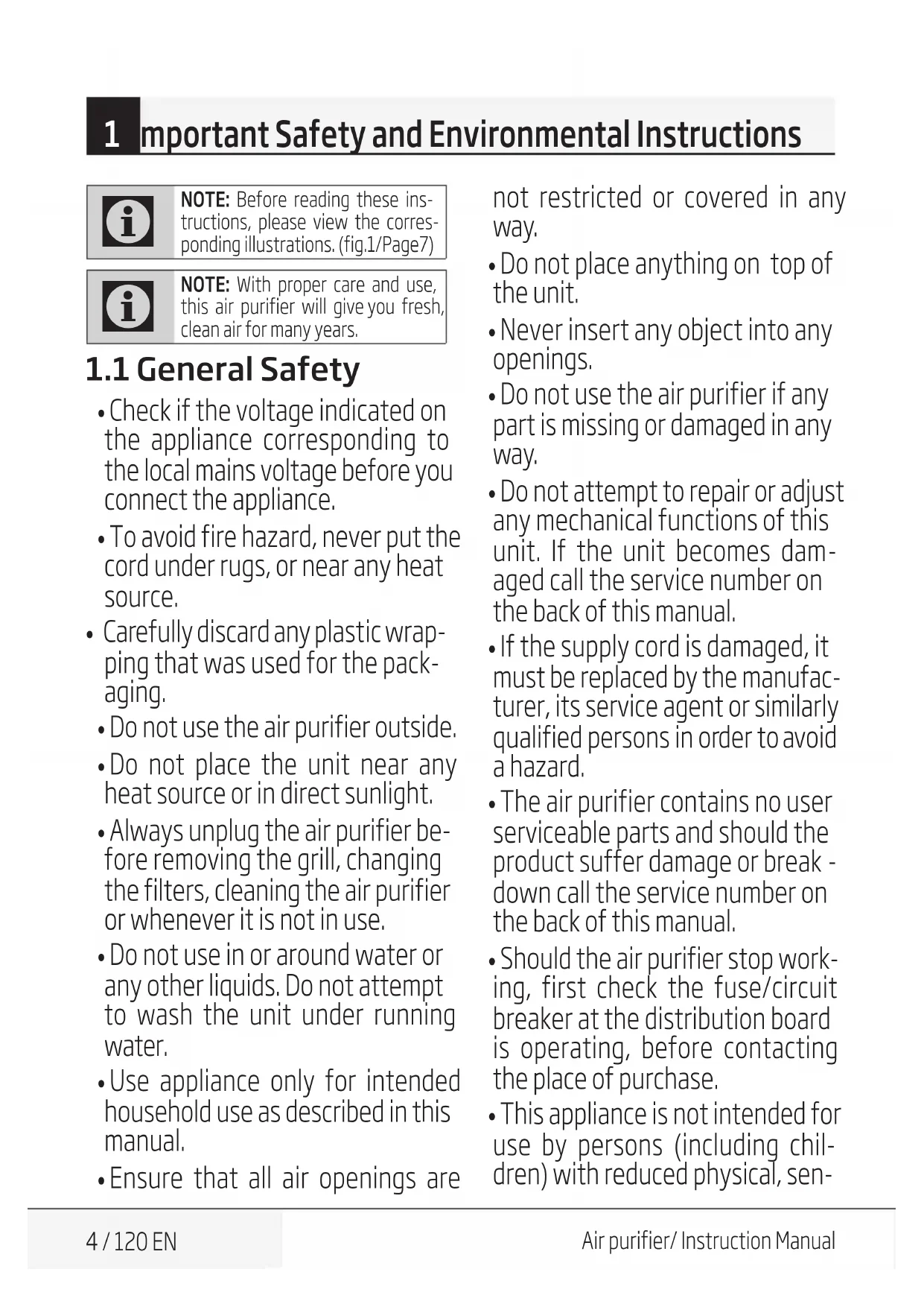 NOTE: Before readng these ns-tructons, please vew the corres-pondng llustratons. (fg.1/Page7) NOTE: Wth proper care and use, ths ar purfer wll gve you fresh, clean ar for many years. 4 / 120 EN Air purifier/ Instruction ManualAir purifier/ Instruction Manual 5 / EN sory or mental capabilities, or lack of experience and knowledge, un- less they have been given super- vision or instruction concerning use o f the appliance by a person responsible for their safety.