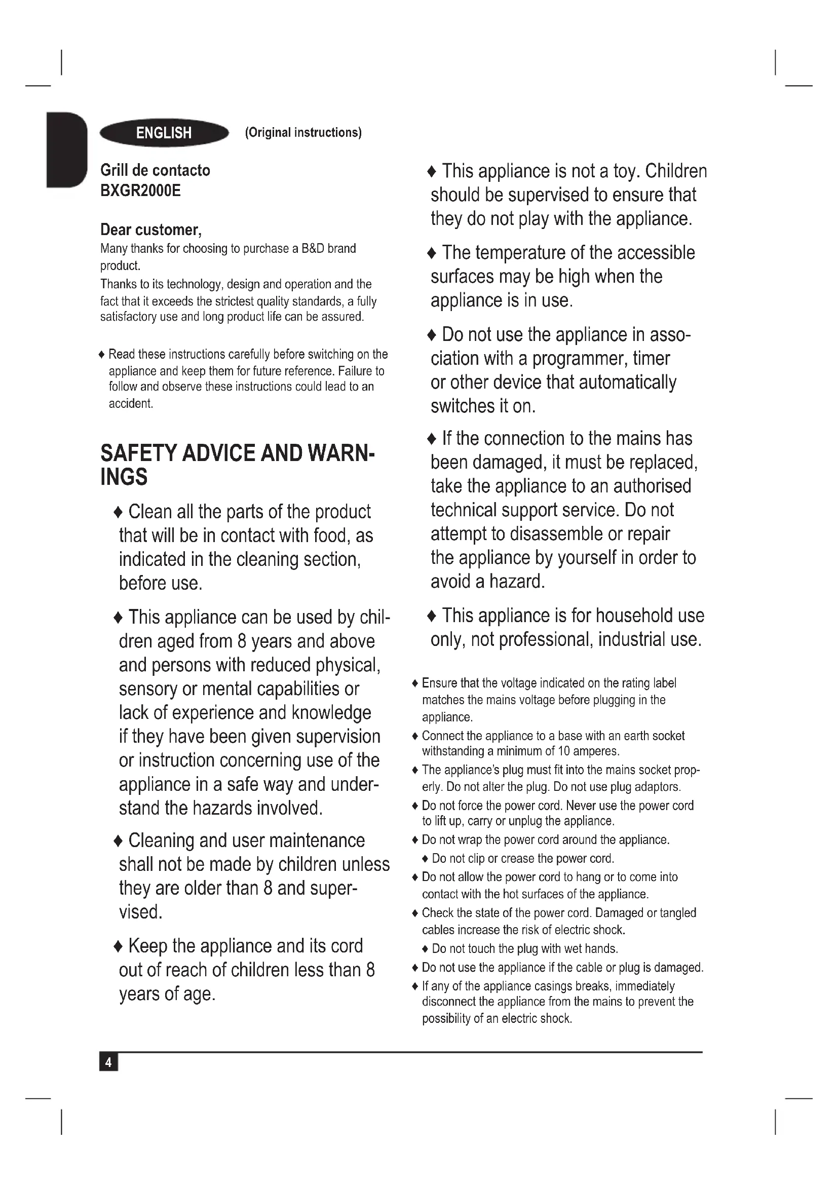 Grill de contacto BXGR2000E Dear customer, Many thanks for choosing to purchase a B&D brand product. Thanks to its technology, design and operation and the fact that it exceeds the strictest quality standards, a fully satisfactory use and long product life can be assured. ♦ Read these instructions carefully before switching on the appliance and keep them for future reference. Failure to follow and observe these instructions could lead to an accident.