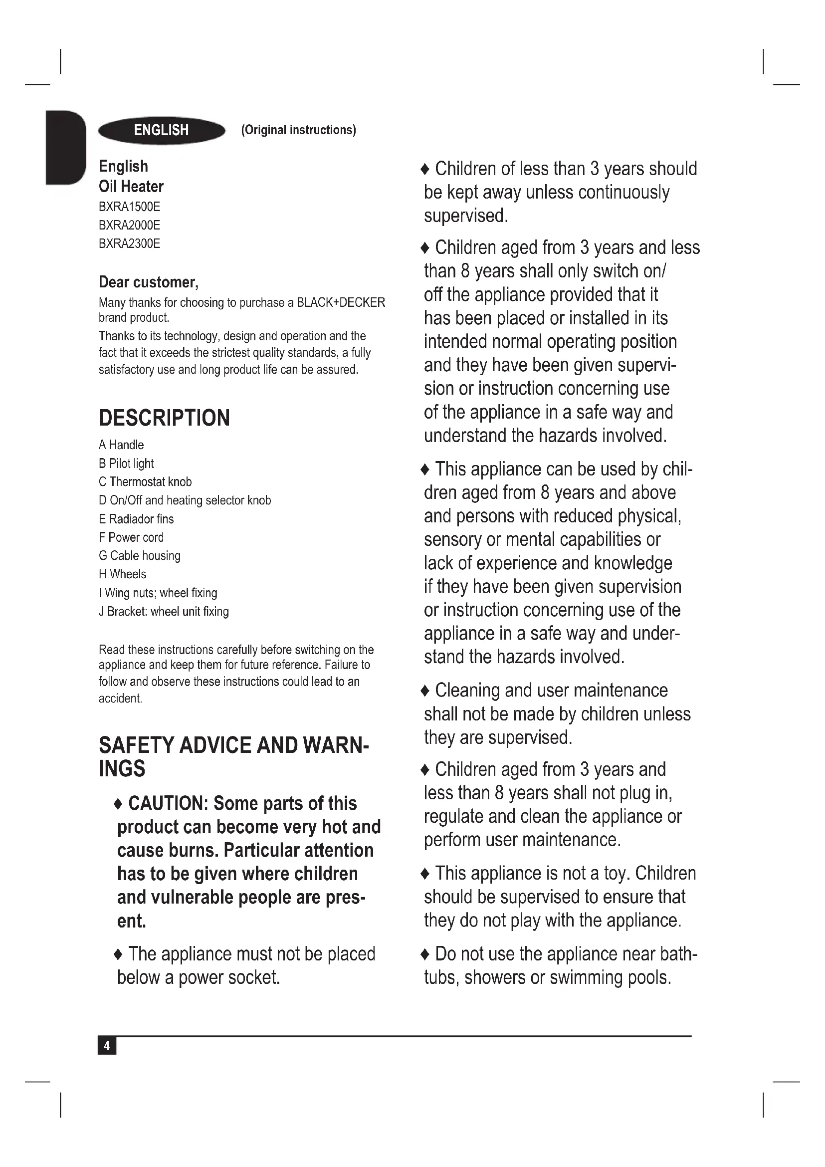 English Oil Heater BXRA1500E BXRA2000E BXRA2300E Dear customer, Many thanks for choosing to purchase a BLACK+DECKER brand product. Thanks to its technology, design and operation and the fact that it exceeds the strictest quality standards, a fully satisfactory use and long product life can be assured. DESCRIPTION A Handle B Pilot light C Thermostat knob D On/Off and heating selector knob E Radiador ns F Power cord G Cable housing H Wheels I Wing nuts; wheel xing J Bracket: wheel unit xing Read these instructions carefully before switching on the appliance and keep them for future reference. Failure to follow and observe these instructions could lead to an accident.