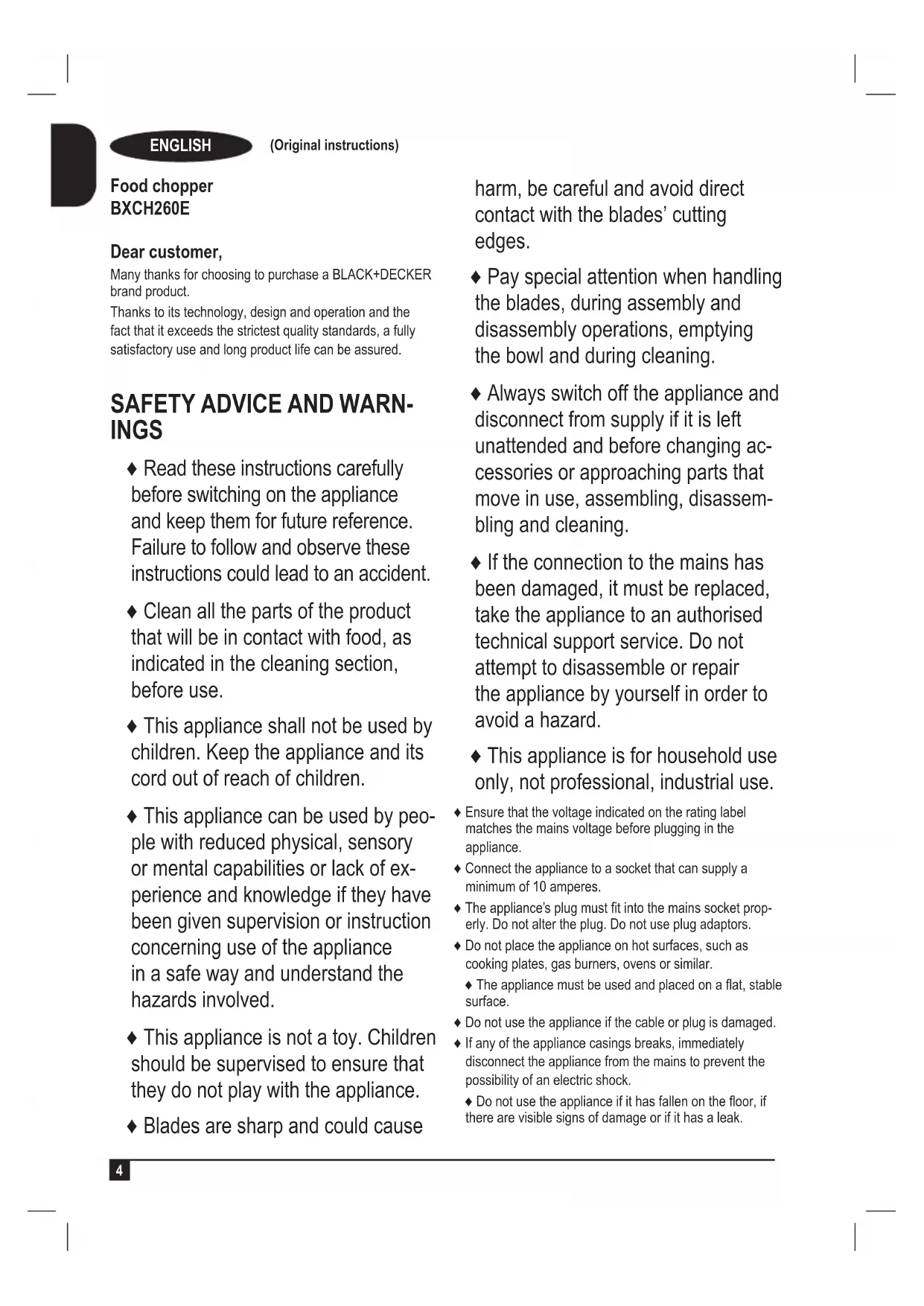 Food chopper BXCH260E Dear customer, Many thanks for choosing to purchase a BLACK+DECKER brand product. Thanks to its technology, design and operation and the fact that it exceeds the strictest quality standards, a fully satisfactory use and long product life can be assured.