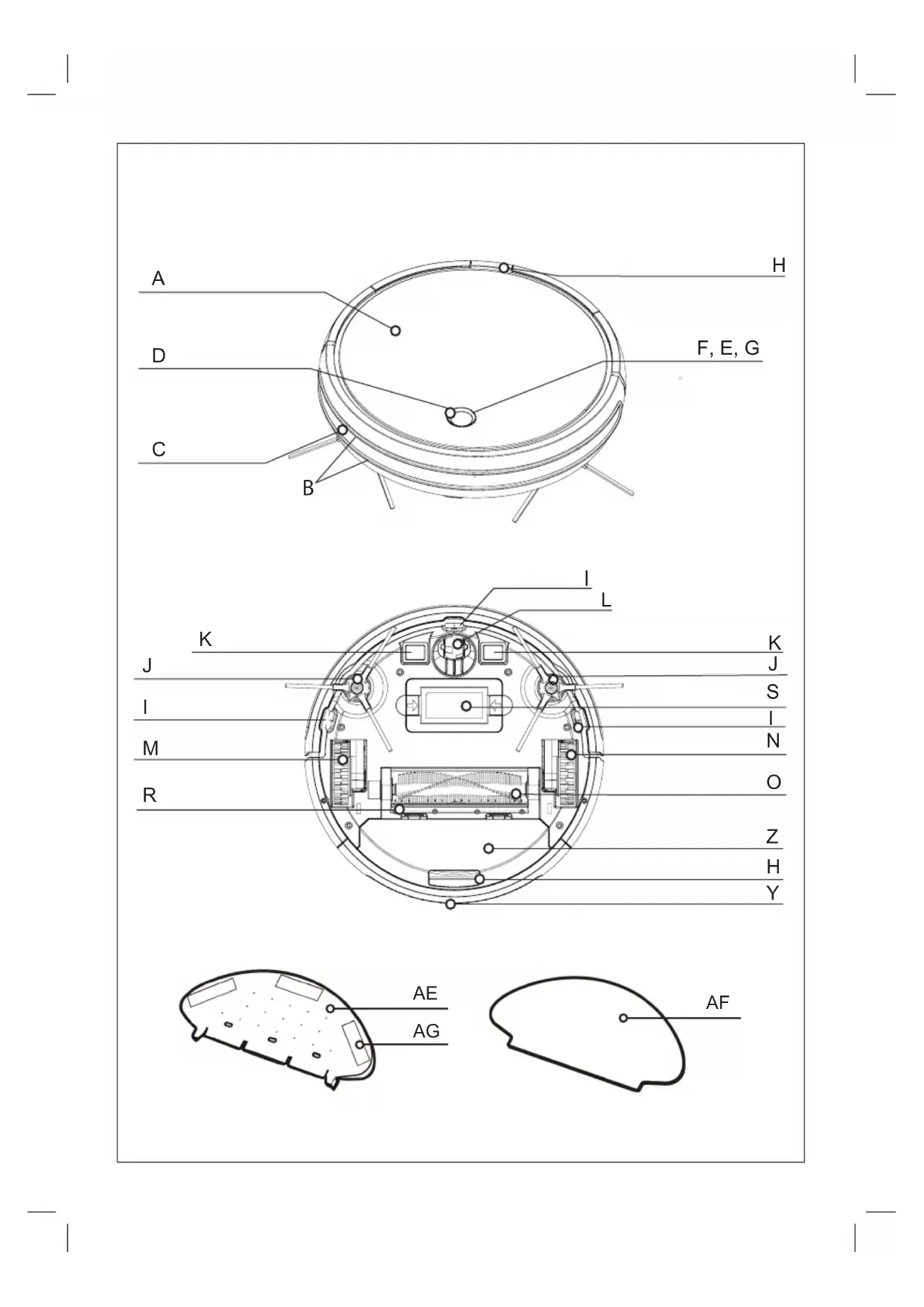♦ Avoid all contact with the liquid that could be released from the battery. In case of contact with eyes, wash them thoroughly and seek medical advice. The liquid spilled from the battery may cause irritation or burns. Use and care: ♦ Do not use the appliance if its accessories are not properly tted. ♦ Do not use the appliance to gather up water or any other liquid. ♦ Do not use the appliance if the on/off switch does not work. ♦ Remove the batteries from the appliance if you are not going to use it for some time. ♦ Store this appliance out of reach of children and/or persons with physical, sensory or reduced mental or lack of experience and knowledge. ♦ Do not work on areas where there are metal objects, such as nails and/or screws. ♦ Never vacuum hot or sharp objects (cigarette butts, ashes, nails, etc.). ♦ Do not use the appliance to pick up liquids, toxic subs- tances, ammable or combustible liquids. ♦ Do not operate behind the re or in the presence of explosives and/or ammable fumes or liquids. ♦ To prevent accidents, store vacuum after each sure. ♦ Do not open the battery/ies under any circumstances whatsoever. ♦ When the battery/ies is not in use, keep it away from other metal objects like paper clips, coins, keys, screws ... that could connect a terminal to another. ♦ Do not short-circuit the battery terminals as this may cause an explosion or re. ♦ The battery/ies should be stored at a temperature of below 40ºC. ♦ Recharge the battery/ies only with the charger supplied by the manufacturer. A charger that is suitable for one type of battery may cause explosion or re hazard when used with other battery/ies. ♦ Use the device only with the battery/ies for which has been specically designed. The use of any other battery/ ies s can cause an explosion or re hazard. ♦ The appliance is for indoor use Service: ♦ Make sure that the appliance is serviced only by specialist personnel, and that only original spare parts or accessories are used to replace existing parts/acces- sories. ♦ CAUTION: There is a risk of re if the appliance’s clea- ning is not done according to these instructions. ♦ Any misuse or failure to follow the instructions for use renders the guarantee and the manufacturer's liability null and void. Description TOP VIEW A Robot vacuum cleaner top cover B Anti-scratch band C Front impact infrared sensor D Operation button E Red light xed or blinking error F Operating light G Charge light indicator. H Dust Box Button BOTTOM VIEW I Anti-fall sensors J Side brushes K Charge contact points L Swivel wheels M Right wheel N Left wheel O Main rotative brush R Rubber brush S Battery cover CHARGING BASE U Charging base V Sensor base W Charger X Charge contact points DUST TANK Y Dust tank Z Dust tank cover AA Textile pre-lter AB EPA Filter AC Sponge Filter H Dust container removal button WATER TANK AE Water tank AF Microber mop AG Hermetic water tank lid AH Self-cleaning brushENGLISH (Original instructions)