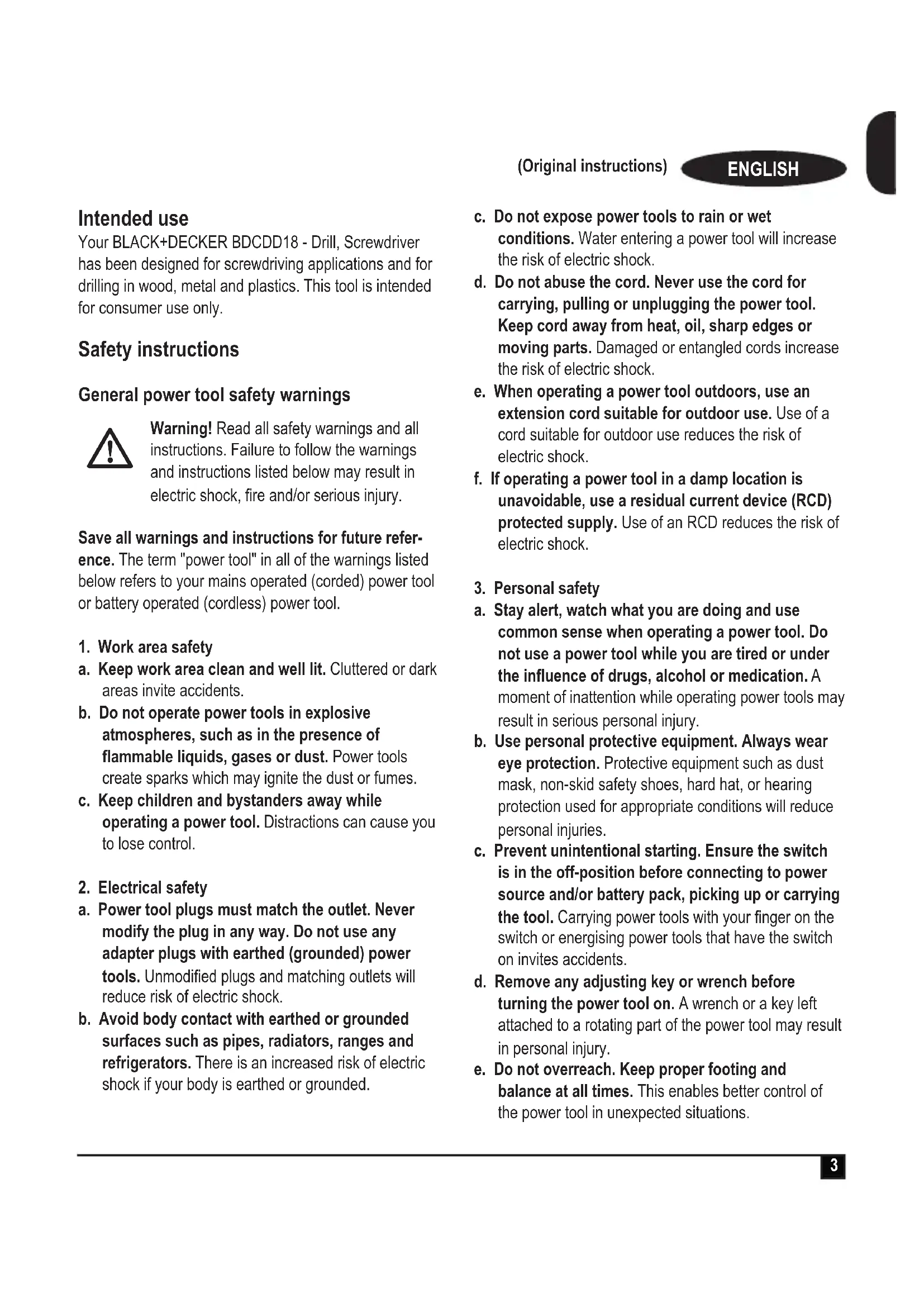 Intended use Your BLACK+DECKER BDCDD18 - Drill, Screwdriver has been designed for screwdriving applications and for drilling in wood, metal and plastics. This tool is intended for consumer use only. Safety instructions General power tool safety warnings
