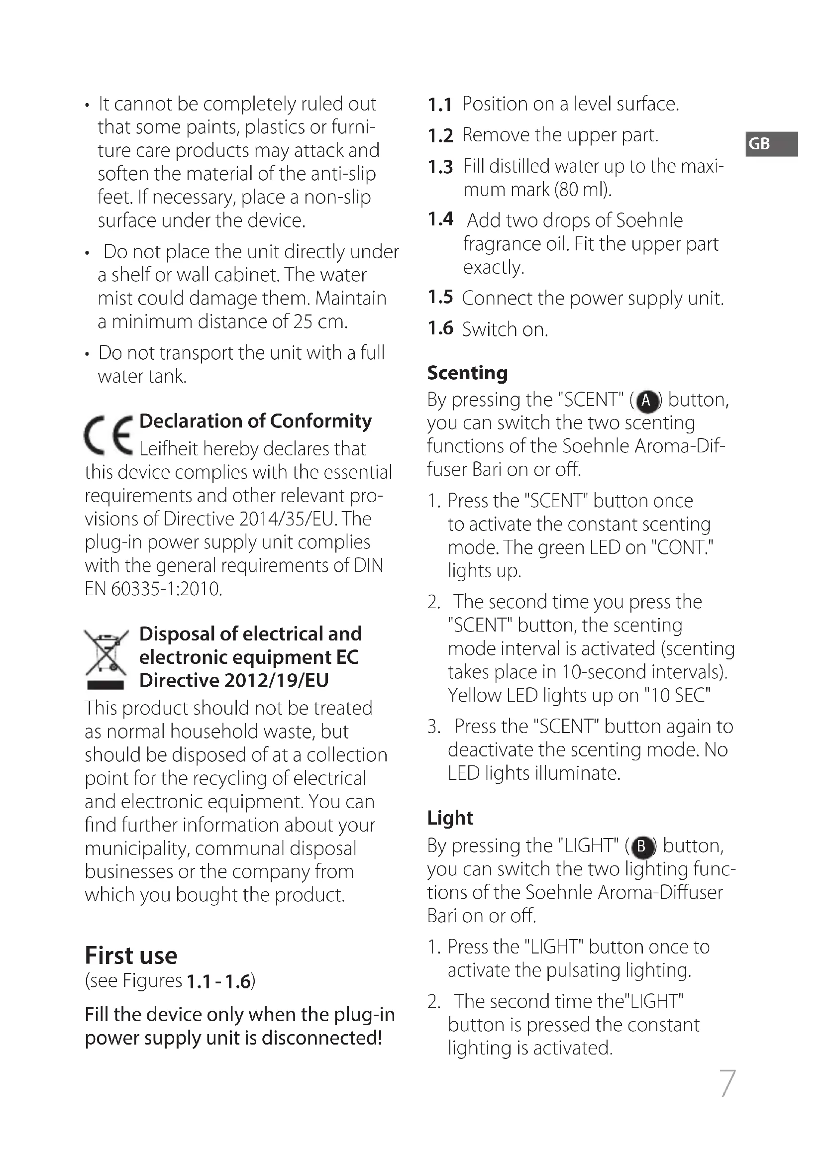 - Do not transport the unit with a full water tank. Declaration of Conformity Leifheit hereby declares that this device complies with the essential requirements and other relevant pro- visions of Directive 2014/35/EU. The plug-in power supply unit complies with the general requirements of DIN EN 60335-1:2010. Disposal of electrical and electronic equipment EC Directive 2012/19/EU This product should not be treated as normal household waste, but should be disposed of at a collection point for the recycling of electrical and electronic equipment. You can find further information about your municipality, communal disposal businesses or the company from which you bought the product. First use (see Figures