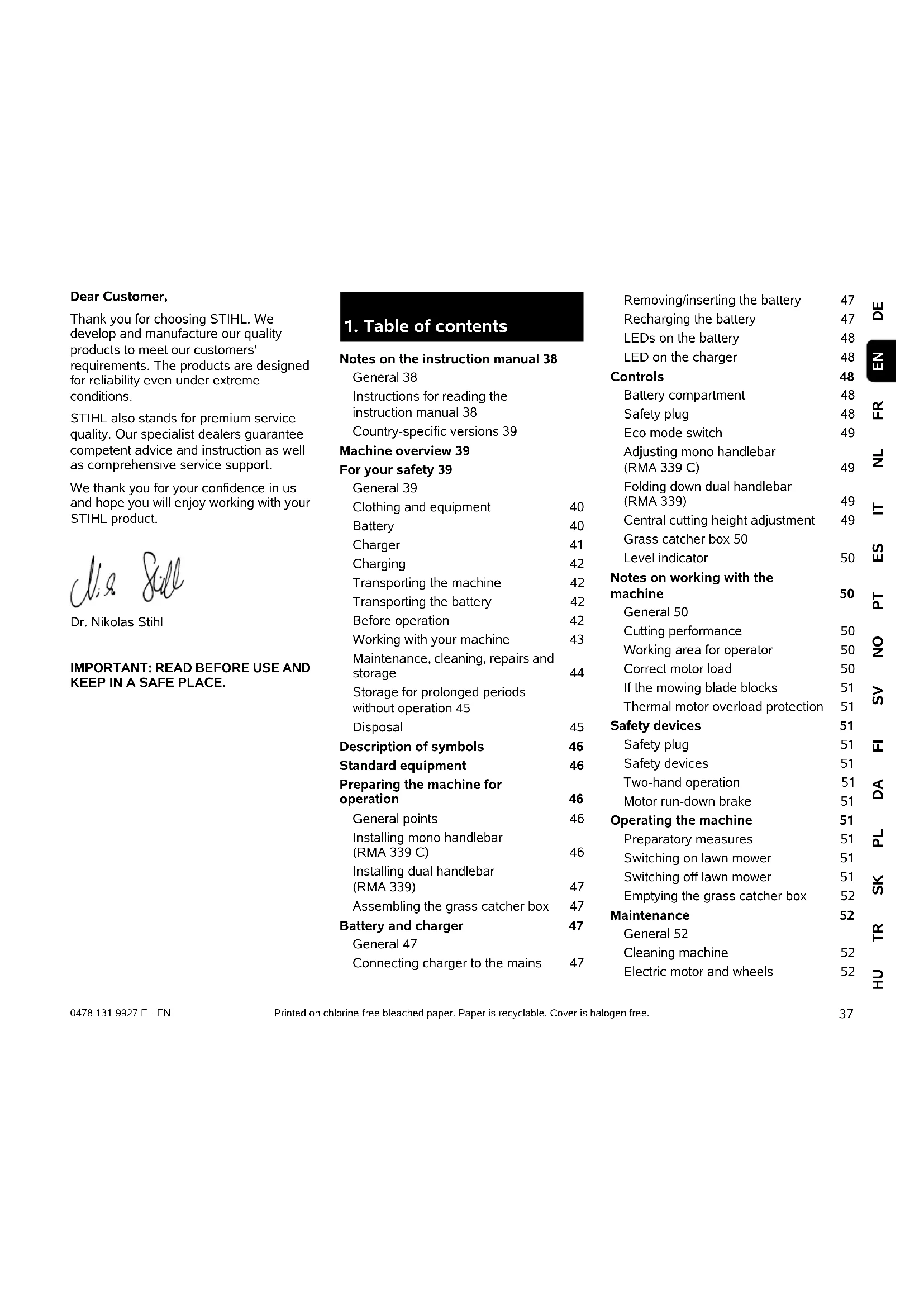 Notes on the instruction manual 38 General 38 Instructions for reading the instruction manual 38 Country-specific versions 39 Machine overview 39 For your safety 39 General 39 Clothing and equipment 40 Battery 40 Charger 41 Charging 42 Transporting the machine 42 Transporting the battery 42 Before operation 42 Working with your machine 43 Maintenance, cleaning, repairs and storage 44 Storage for prolonged periods without operation 45 Disposal 45 Description of symbols 46 Standard equipment 46 Preparing the machine for operation 46 General points 46 Installing mono handlebar (RMA 339 C) 46 Installing dual handlebar (RMA 339) 47 Assembling the grass catcher box 47 Battery and charger 47 General 47 Connecting charger to the mains 47 Removing/inserting the battery 47 Recharging the battery 47 LEDs on the battery 48 LED on the charger 48 Controls 48 Battery compartment 48 Safety plug 48 Eco mode switch 49 Adjusting mono handlebar (RMA 339 C) 49 Folding down dual handlebar (RMA 339) 49 Central cutting height adjustment 49 Grass catcher box 50 Level indicator 50 Notes on working with the machine 50 General 50 Cutting performance 50 Working area for operator 50 Correct motor load 50 If the mowing blade blocks 51 Thermal motor overload protection 51 Safety devices 51 Safety plug 51 Safety devices 51 Two-hand operation 51 Motor run-down brake 51 Operating the machine 51 Preparatory measures 51 Switching on lawn mower 51 Switching off lawn mower 51 Emptying the grass catcher box 52 Maintenance 52 General 52 Cleaning machine 52 Electric motor and wheels 520478 131 9927 E - EN