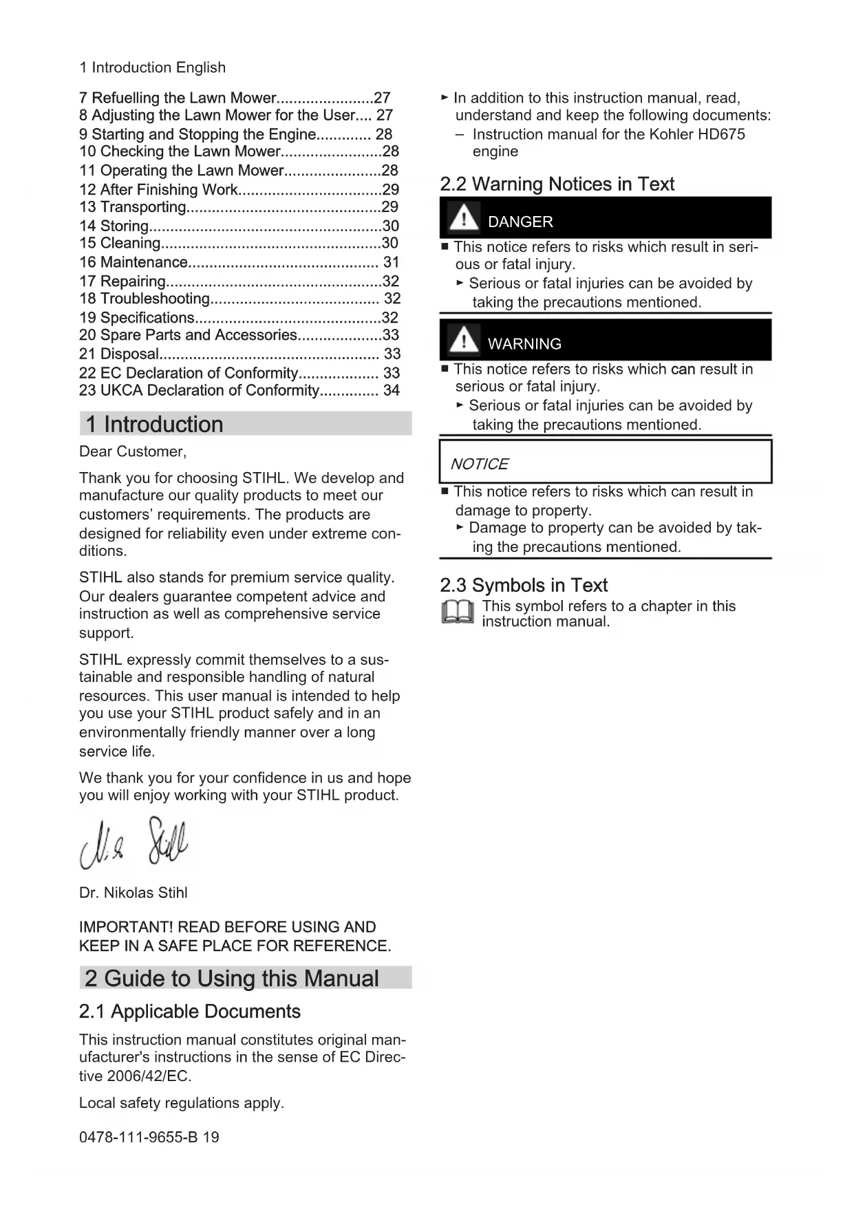 - 23 UKCA Declaration of Conformity 1 Introduction Dear Customer, Thank you for choosing STIHL. We develop and manufacture our quality products to meet our customers’ requirements. The products are designed for reliability even under extreme con‐ ditions. STIHL also stands for premium service quality. Our dealers guarantee competent advice and instruction as well as comprehensive service support. STIHL expressly commit themselves to a sus‐ tainable and responsible handling of natural resources. This user manual is intended to help you use your STIHL product safely and in an environmentally friendly manner over a long service life. We thank you for your confidence in us and hope you will enjoy working with your STIHL product. Dr. Nikolas Stihl p. 34