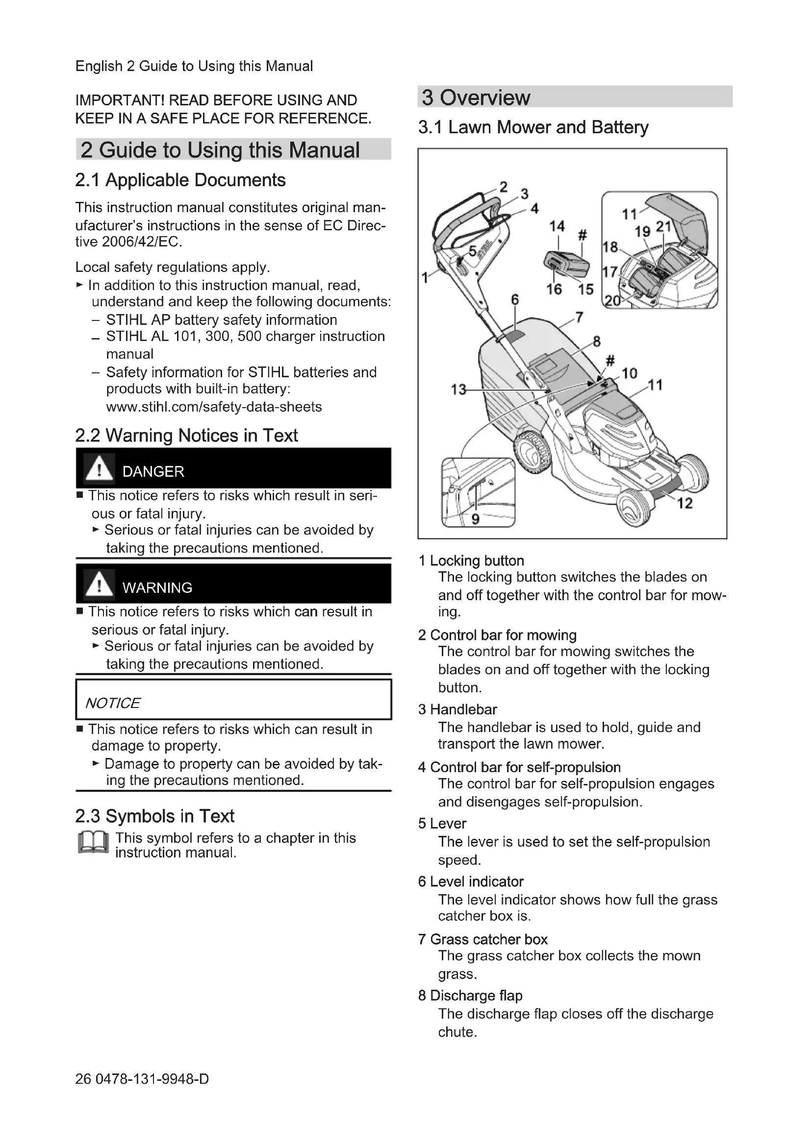 1 Locking button The locking button switches the blades on and off together with the control bar for mow‐ ing. 2 Control bar for mowing The control bar for mowing switches the blades on and off together with the locking button. 3 Handlebar The handlebar is used to hold, guide and transport the lawn mower. 4 Control bar for self-propulsion The control bar for self-propulsion engages and disengages self-propulsion. 5 Lever The lever is used to set the self-propulsion speed. 6 Level indicator The level indicator shows how full the grass catcher box is. 7 Grass catcher box The grass catcher box collects the mown grass. 8 Discharge flap The discharge flap closes off the discharge chute. English 2 Guide to Using this Manual 26 0478-131-9948-D9 Lever The lever is used to set the cutting height. 10 Handle The handle is used to hold the lawn mower when adjusting the cutting height and to transport the lawn mower. 11 Flap The flap covers the battery and activation key. 12 Transport handle The transport handle is used to transport the lawn mower. 13 Lever The lever is used to adjust and fold down the handlebar. 14 Battery The battery supplies the lawn mower with power. 15 Button The button activates the LEDs on the battery. 16 LEDs The LEDs indicate the battery charge state and faults. 17 Battery compartment The battery compartment holds the battery. 18 ECO switch The ECO switch activates and deactivates ECO mode. 19 Activation key The activation key activates the lawn mower. 20 The locking lever keeps the battery in the bat‐ tery compartment. RMA 443.2 PV, RMA 448.2 PV: 21 Battery compartment The battery compartment holds a second bat‐ tery. RMA 443.2 VC, RMA 448.2 VC: 21 Transport compartment The transport compartment holds a replace‐ ment battery. # Rating plate with machine number
