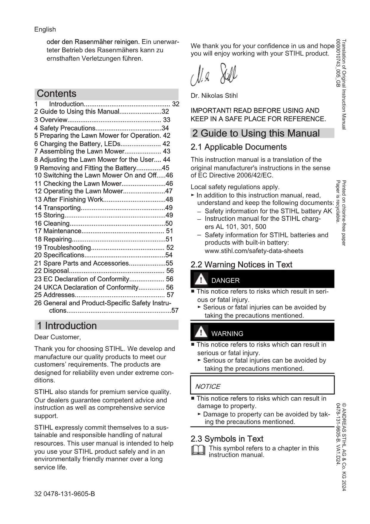 This symbol refers to a chapter in this instruction manual. English 32 0478-131-9605-B © ANDREAS STIHL AG & Co. KG 2024 0478-131-9605-B. VA1.D24. Printed on chlorine-free paper Paper is recyclable. Translation of Original Instruction Manual 0000010743_005_GB3 Overview