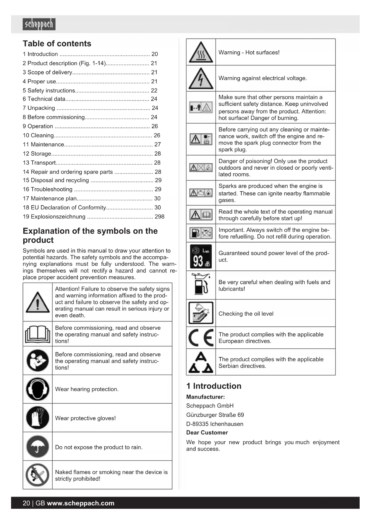 - Produktabhängig auch über 24 Monate; länderbezogen können erweiterte Garantieleistungen gelten ** Verbindungskosten: kostenlos aus dem deutschen Festnetz Änderungen dieser Garantiebedingungen ohne Voranmeldung behalten wir uns jederzeit vor. Ersatzteile Zubehör Reparatur Kontakt Dokumente DE | 19www.scheppach.comTable of contents 1 Introduction ........................................................ 20 2 Product description (Fig. 1-14)........................... 21 3 Scope of delivery................................................ 21 4 Proper use.......................................................... 21 5 Safety instructions.............................................. 22 6 Technical data.................................................... 24 7 Unpacking .......................................................... 24 8 Before commissioning........................................ 24 9 Operation ........................................................... 26 10 Cleaning............................................................. 26 11 Maintenance....................................................... 27 12 Storage............................................................... 28 13 Transport............................................................ 28 14 Repair and ordering spare parts ........................ 28 15 Disposal and recycling ....................................... 29 16 Troubleshooting ................................................. 29 17 Maintenance plan............................................... 30 18 EU Declaration of Conformity............................. 30 19 Explosionszeichnung ......................................... 298 Explanation of the symbols on the product Symbols are used in this manual to draw your attention to potential hazards. The safety symbols and the accompa- nying explanations must be fully understood. The warn- ings themselves will not rectify a hazard and cannot re- place proper accident prevention measures. Attention! Failure to observe the safety signs and warning information affixed to the prod- uct and failure to observe the safety and op- erating manual can result in serious injury or even death. Before commissioning, read and observe the operating manual and safety instruc- tions! Before commissioning, read and observe the operating manual and safety instruc- tions! Wear hearing protection. Wear protective gloves! Do not expose the product to rain. Naked flames or smoking near the device is strictly prohibited! Warning - Hot surfaces! Warning against electrical voltage. Make sure that other persons maintain a sufficient safety distance. Keep uninvolved persons away from the product. Attention: hot surface! Danger of burning. Before carrying out any cleaning or mainte- nance work, switch off the engine and re- move the spark plug connector from the spark plug. Danger of poisoning! Only use the product outdoors and never in closed or poorly venti- lated rooms. Sparks are produced when the engine is started. These can ignite nearby flammable gases. Read the whole text of the operating manual through carefully before start up! Important. Always switch off the engine be- fore refuelling. Do not refill during operation. Guaranteed sound power level of the prod- uct. Be very careful when dealing with fuels and lubricants! Checking the oil level The product complies with the applicable European directives. The product complies with the applicable Serbian directives. 1 Introduction Manufacturer: Scheppach GmbH Günzburger Straße 69 D-89335 Ichenhausen Dear Customer We hope your new product brings you much enjoyment and success. 20 | GB www.scheppach.comNote: In accordance with the applicable product liability laws, the manufacturer of this product assumes no liability for damage to the product or caused by the product arising from: