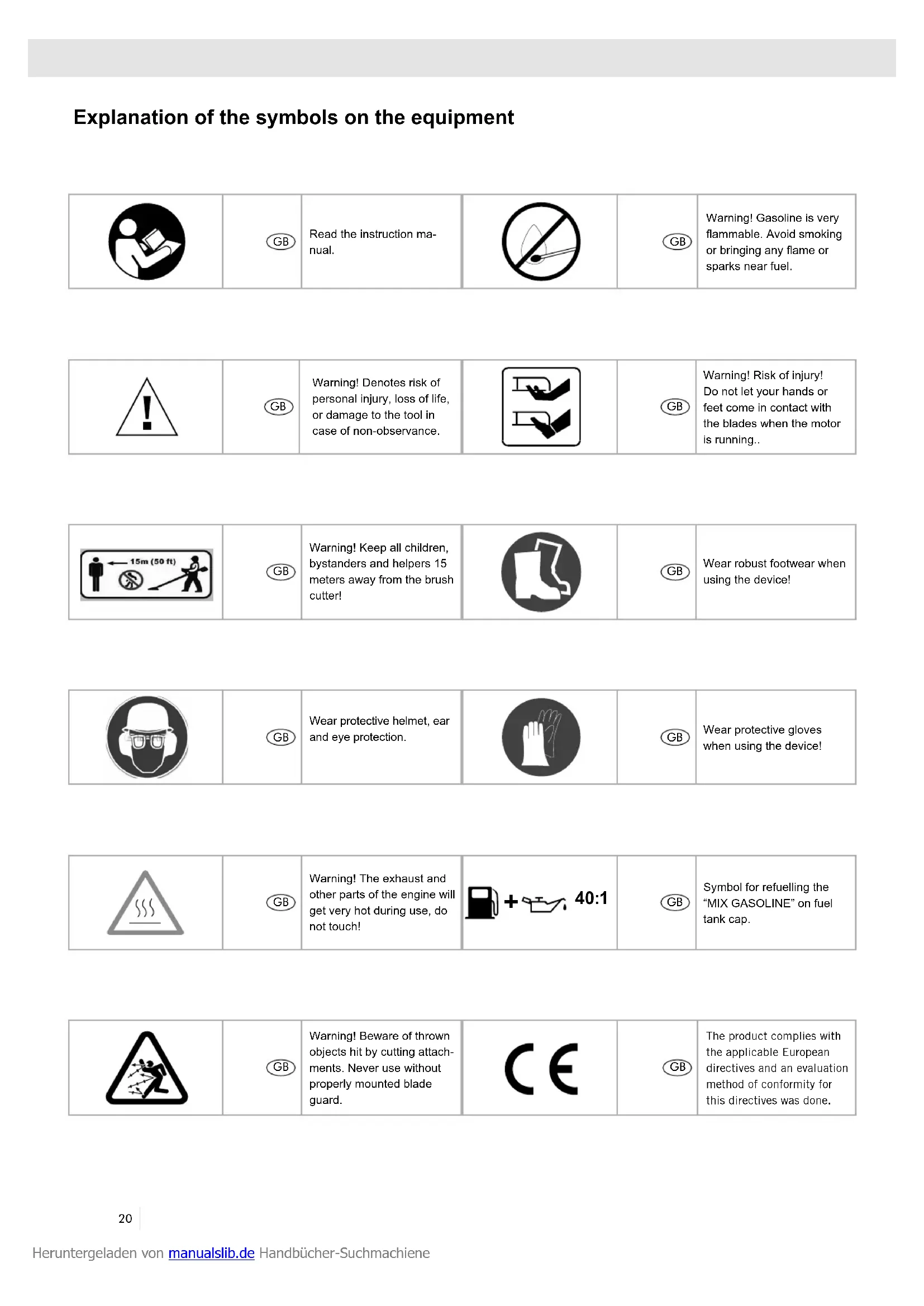 Read the instruction ma-nual. Warning! Denotes risk of personal injury, loss of life, or damage to the tool in case of non-observance. Warning! The exhaust and other parts of the engine will get very hot during use, do not touch! Warning! Beware of thrown objects hit by cutting attach-ments. Never use without properly mounted blade guard. The product complies with the applicable European directives and an evaluation method of conformity for this directives was done. Warning! Keep all children, bystanders and helpers 15 meters away from the brush cutter! Wear protective helmet, ear and eye protection. Warning! Gasoline is very ammable. Avoid smoking or bringing any ame or sparks near fuel. Warning! Risk of injury!Do not let your hands or feet come in contact with the blades when the motor is running.. Wear robust footwear when using the device! Wear protective gloves when using the device!