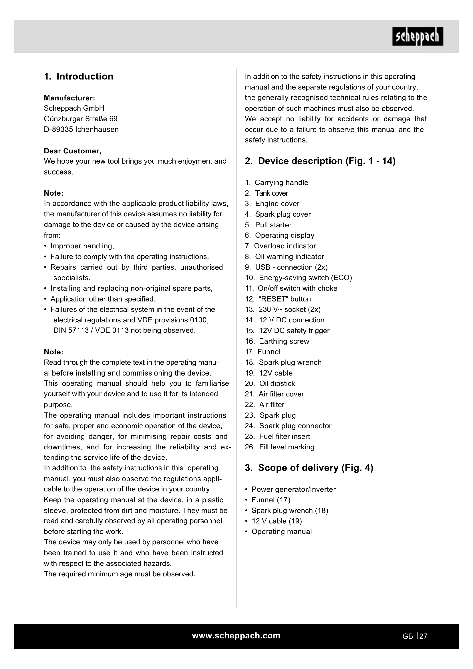 Manufacturer: Scheppach GmbH Günzburger Straße 69 D-89335 Ichenhausen Dear Customer, We hope your new tool brings you much enjoyment and success. Note: In accordance with the applicable product liability laws, the manufacturer of this device assumes no liability for damage to the device or caused by the device arising from: