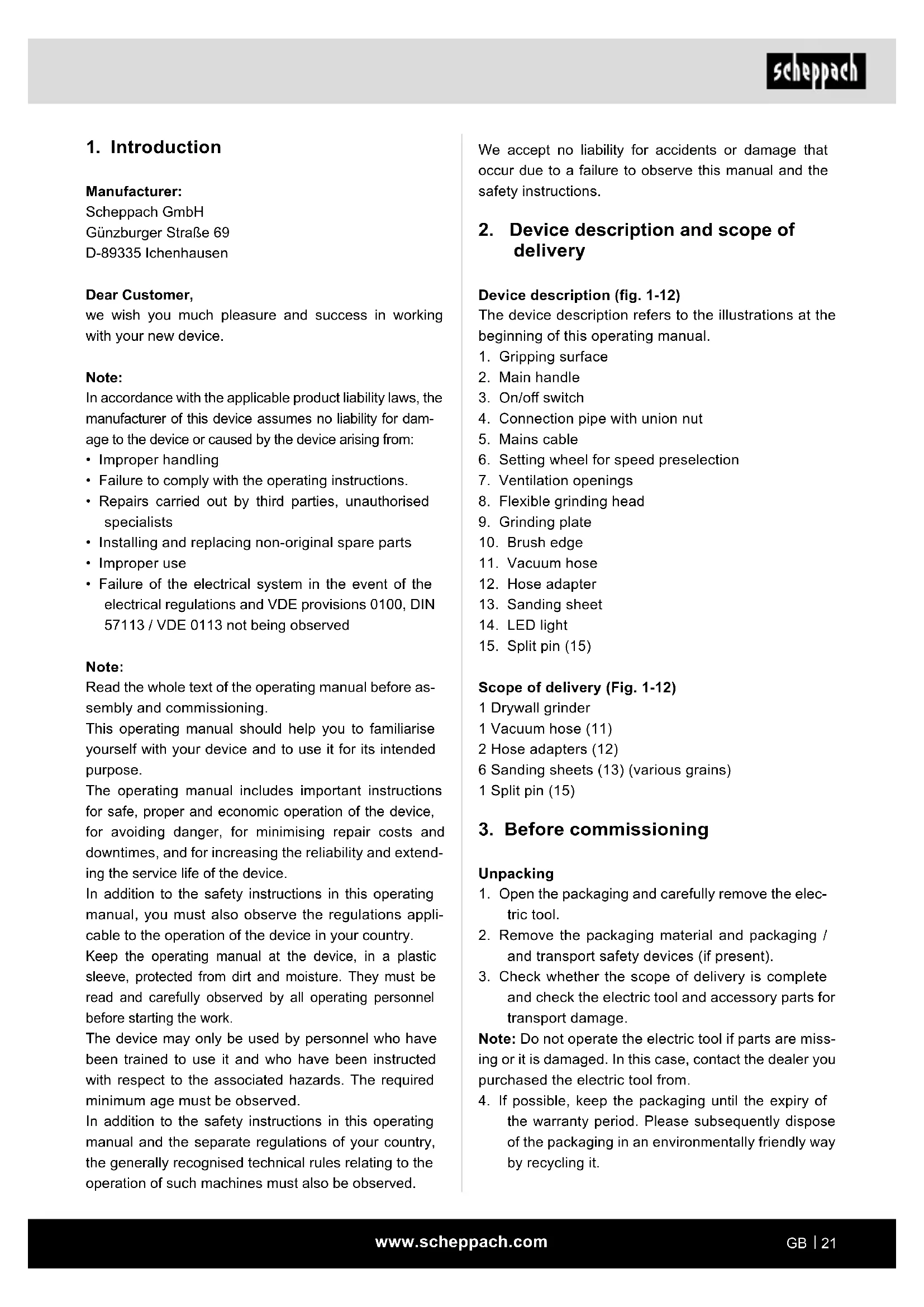 Manufacturer: Scheppach GmbH Günzburger Straße 69 D-89335 Ichenhausen Dear Customer, we wish you much pleasure and success in working with your new device. Note: In accordance with the applicable product liability laws, the manufacturer of this device assumes no liability for dam- age to the device or caused by the device arising from: