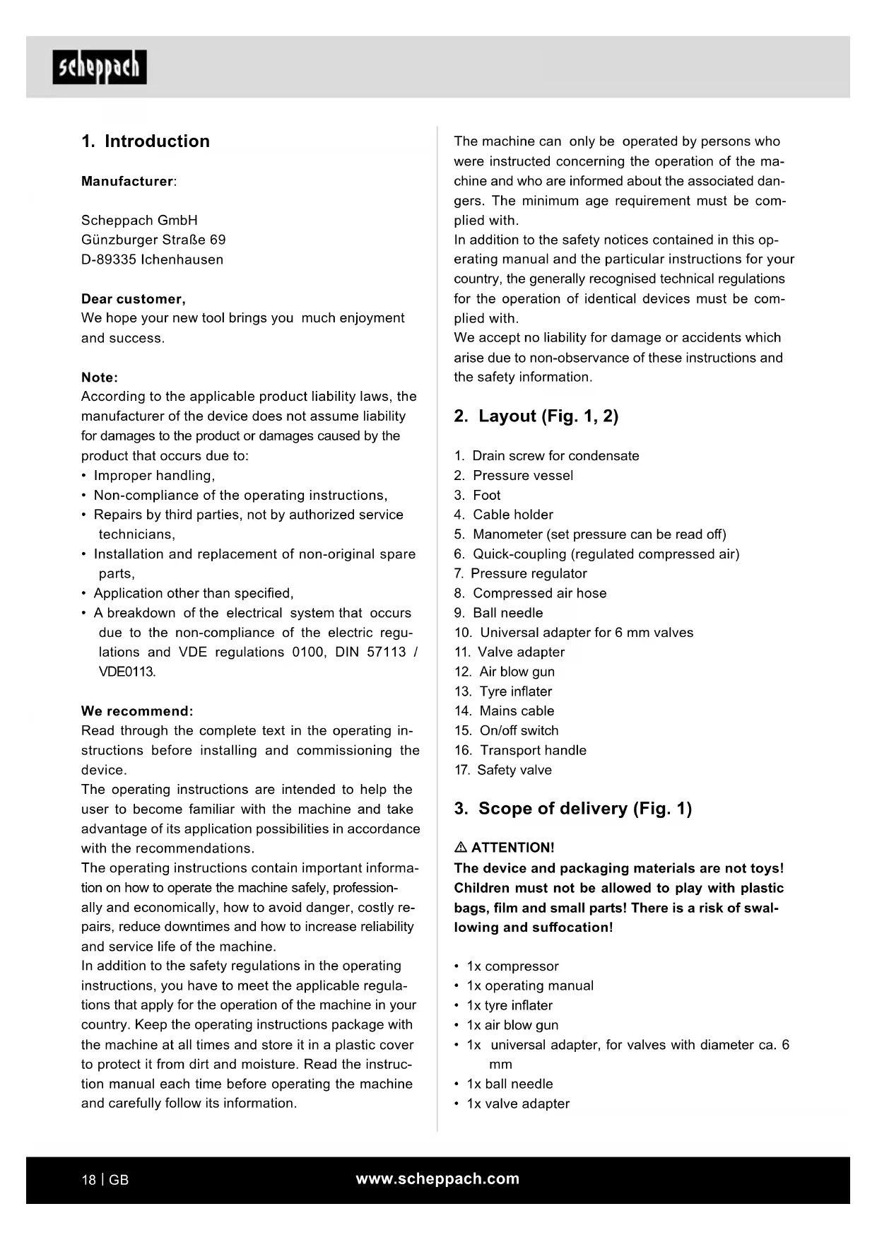 Manufacturer: Scheppach GmbH Günzburger Straße 69 D-89335 Ichenhausen Dear customer, We hope your new tool brings you much enjoyment and success. Note: According to the applicable product liability laws, the manufacturer of the device does not assume liability for damages to the product or damages caused by the product that occurs due to: