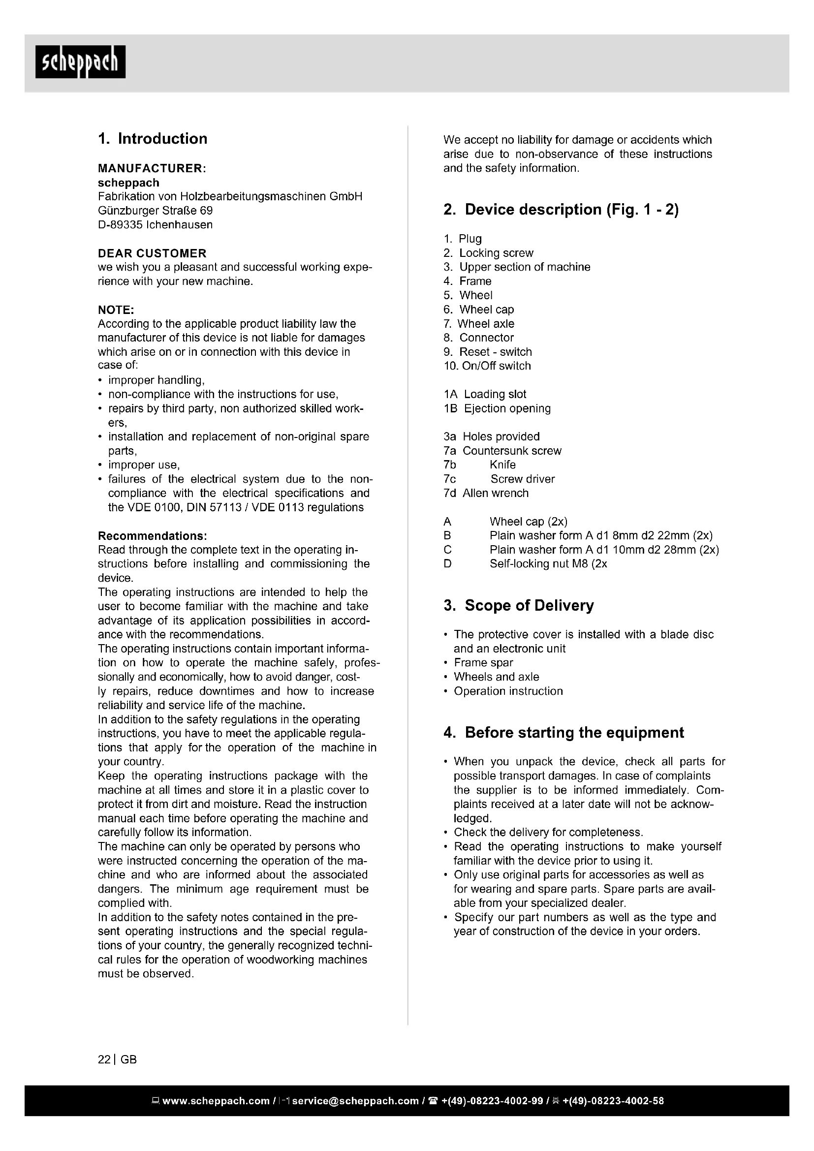 MANUFACTURER: scheppach Fabrikation von Holzbearbeitungsmaschinen GmbH Günzburger Straße 69 D-89335 Ichenhausen DEAR CUSTOMER we wish you a pleasant and successful working expe- rience with your new machine. NOTE: According to the applicable product liability law the manufacturer of this device is not liable for damages which arise on or in connection with this device in case of: