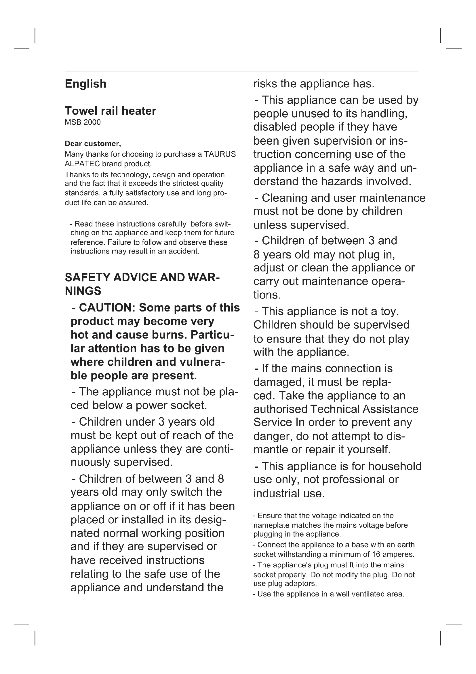 Información de contacto "ELECTRODOMÉSTICOS TAURUS, S.L. Avda. Barcelona S/N 25790 Oliana, Lleida, Spain”English Towel rail heater MSB 2000 Dear customer, Many thanks for choosing to purchase a TAURUS ALPATEC brand product. Thanks to its technology, design and operation and the fact that it exceeds the strictest quality standards, a fully satisfactory use and long pro- duct life can be assured. - Read these instructions carefully before swit- ching on the appliance and keep them for future reference. Failure to follow and observe these instructions may result in an accident.