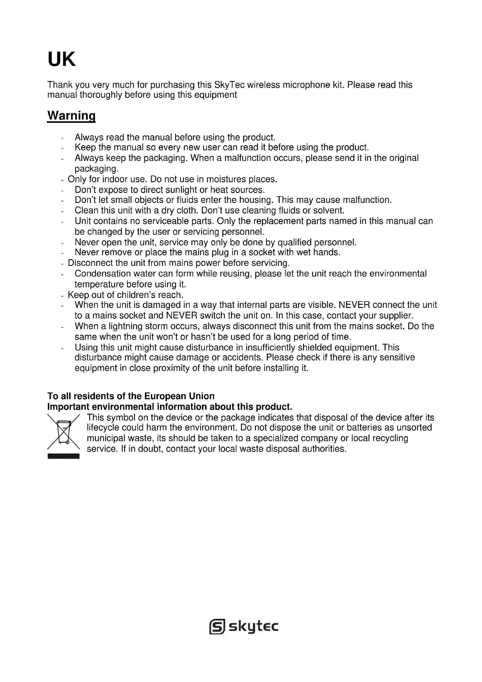 PDT3 TIE CLIP MICROPHONE (179.158) PDH3 HEADSET (179.156)UK Thank you very much for purchasing this SkyTec wireless microphone kit. Please read this manual thoroughly before using this equipment Warning