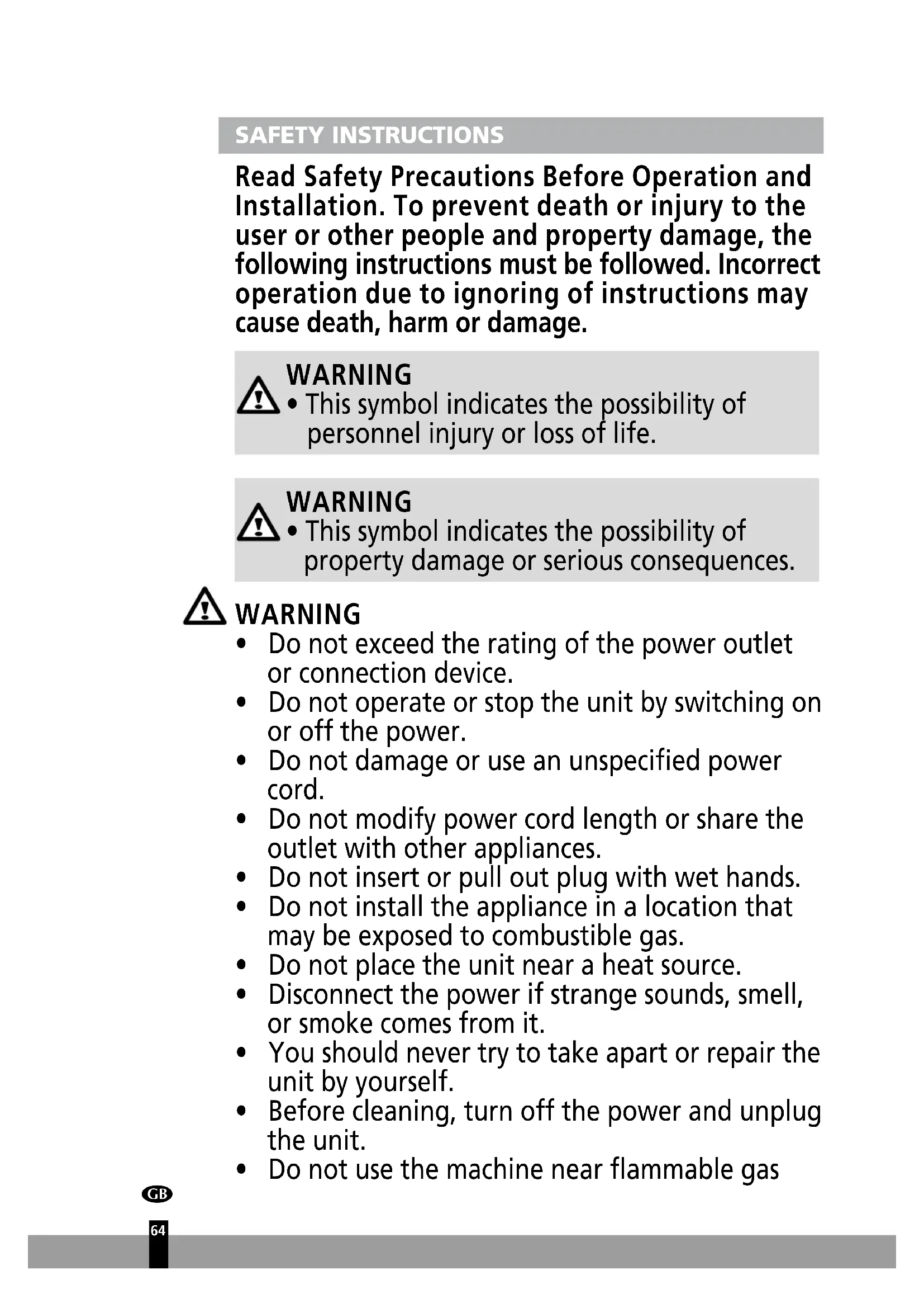 - TROUBLESHOOTING TIPS IMPORTANT NOTE: Read this manual carefully before installing or operating your new machine. Make sure to save this manual for future reference.64 SAFETY INSTRUCTIONS Read Safety Precautions Before Operation and Installation. To prevent death or injury to the user or other people and property damage, the following instructions must be followed. Incorrect operation due to ignoring of instructions may cause death, harm or damage. WARNING