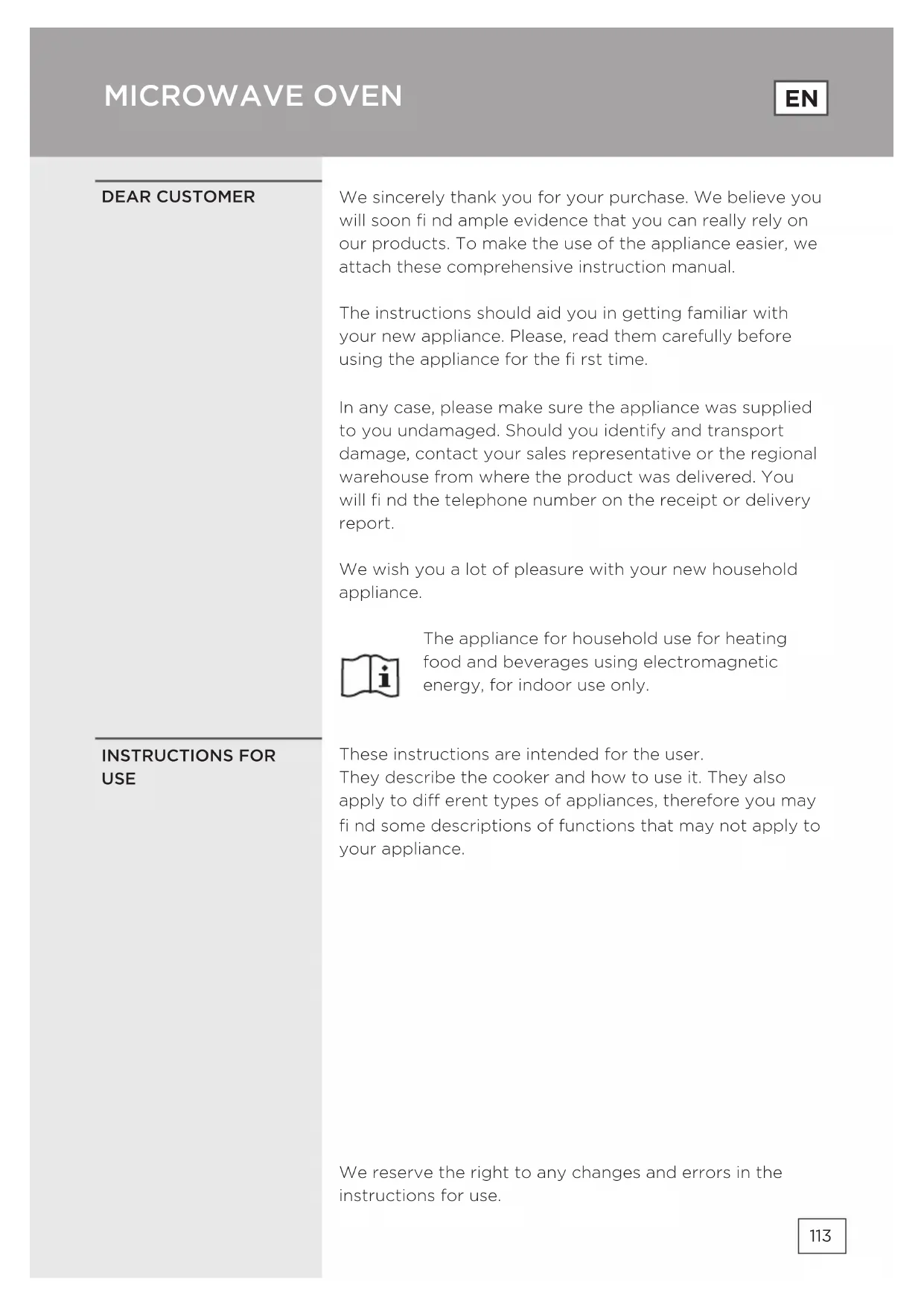 INSTRUCTIONS FOR USE MICROWAVE OVEN We reserve the right to any changes and errors in the instructions for use.Never touch the surfaces of heating or cooking appliances. They will become hot during operation. Keep children at a safe distance. There is a risk of burning! Microwave energy & High voltage! Do not remove the cover. WARNING! The appliance and its accessible parts become hot during use. Care should be taken to avoid touching heating elements. Children less than 8 years of age shall be kept away unless continuously supervised. Children should be supervised to ensure that they do not play with the appliance. This appliance can be used by children aged from 8 years and above and persons with reduced physical, sensory or mental capabilities or lack of experience and knowledge if they have been given supervision or instruction concerning use of the appliance in a safe way and understand the hazards involved. Children shall not play with the appliance. Cleaning and maintenance shall not be made by children unless they are older than 8 and supervised. Keep the appliance and its cord out of reach of children less than 8 years.