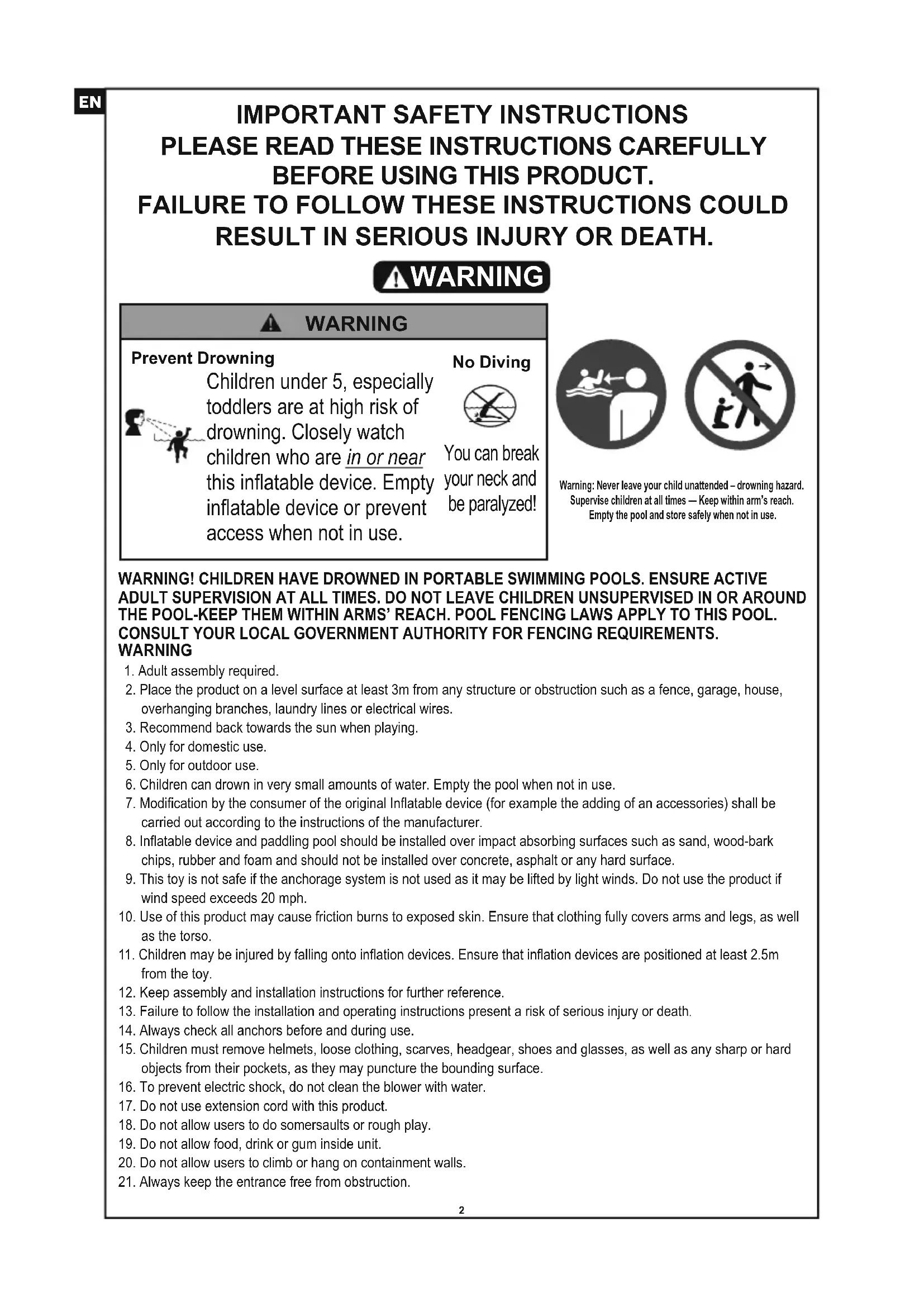 bestwaycorp.com/support Visit Bestway YouTube channel2 Prevent Drowning Children under 5, especially toddlers are at high risk of drowning. Closely watch children who are in or near this inflatable device. Empty inflatable device or prevent access when not in use. WARNING No Diving You can break your neck and be paralyzed! Warning: Never leave your child unattended – drowning hazard.Supervise children at all times — Keep within arm’s reach.Empty the pool and store safely when not in use. WARNING! CHILDREN HAVE DROWNED IN PORTABLE SWIMMING POOLS. ENSURE ACTIVE ADULT SUPERVISION AT ALL TIMES. DO NOT LEAVE CHILDREN UNSUPERVISED IN OR AROUND THE POOL-KEEP THEM WITHIN ARMS’ REACH. POOL FENCING LAWS APPLY TO THIS POOL. CONSULT YOUR LOCAL GOVERNMENT AUTHORITY FOR FENCING REQUIREMENTS. WARNING 1. Adult assembly required. 2. Place the product on a level surface at least 3m from any structure or obstruction such as a fence, garage, house, overhanging branches, laundry lines or electrical wires. 3. Recommend back towards the sun when playing. 4. Only for domestic use. 5. Only for outdoor use. 6. Children can drown in very small amounts of water. Empty the pool when not in use. 7. Modification by the consumer of the original Inflatable device (for example the adding of an accessories) shall be carried out according to the instructions of the manufacturer. 8. Inflatable device and paddling pool should be installed over impact absorbing surfaces such as sand, wood-bark chips, rubber and foam and should not be installed over concrete, asphalt or any hard surface. 9. This toy is not safe if the anchorage system is not used as it may be lifted by light winds. Do not use the product if wind speed exceeds 20 mph. 10. Use of this product may cause friction burns to exposed skin. Ensure that clothing fully covers arms and legs, as well as the torso. 11. Children may be injured by falling onto inflation devices. Ensure that inflation devices are positioned at least 2.5m from the toy.12. Keep assembly and installation instructions for further reference.