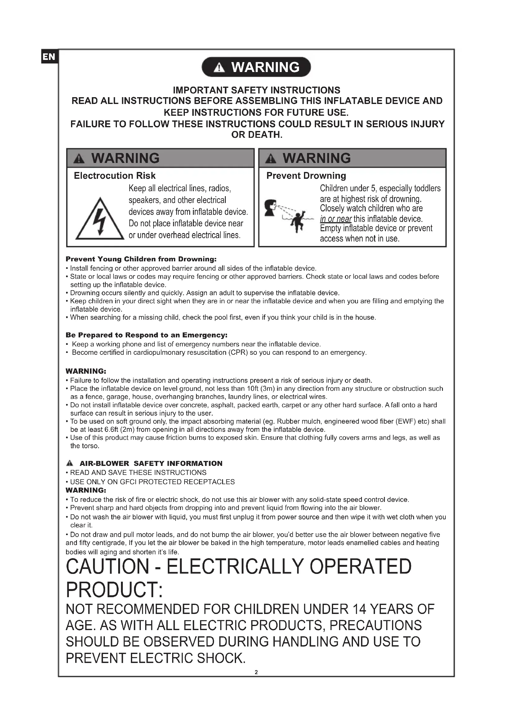 READ ALL INSTRUCTIONS BEFORE ASSEMBLING THIS INFLATABLE DEVICE AND KEEP INSTRUCTIONS FOR FUTURE USE. FAILURE TO FOLLOW THESE INSTRUCTIONS COULD RESULT IN SERIOUS INJURY OR DEATH. WARNING WARNING Electrocution Risk Keep all electrical lines, radios, speakers, and other electrical devices away from inatable device. Do not place inatable device near or under overhead electrical lines. WARNING Prevent Drowning Children under 5, especially toddlers are at highest risk of drowning. Closely watch children who are in or near this inatable device. Empty inatable device or prevent access when not in use.