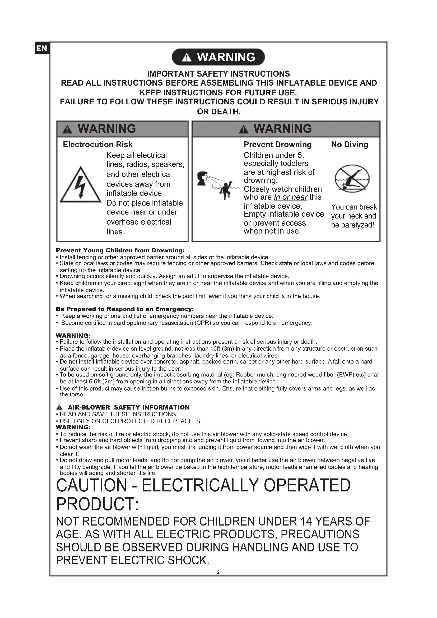 PRODUCT: NOT RECOMMENDED FOR CHILDREN UNDER 14 YEARS OF AGE. AS WITH ALL ELECTRIC PRODUCTS, PRECAUTIONS SHOULD BE OBSERVED DURING HANDLING AND USE TO PREVENT ELECTRIC SHOCK. WARNING Electrocution Risk Keep all electrical lines, radios, speakers, and other electrical devices away from inatable device. Do not place inatable device near or under overhead electrical lines. WARNING Prevent Drowning Children under 5, especially toddlers are at highest risk of drowning. Closely watch children who are in or near this inatable device. Empty inatable device or prevent access when not in use. No Diving You can break your neck and be paralyzed!303021296678_53384_14x21cm_