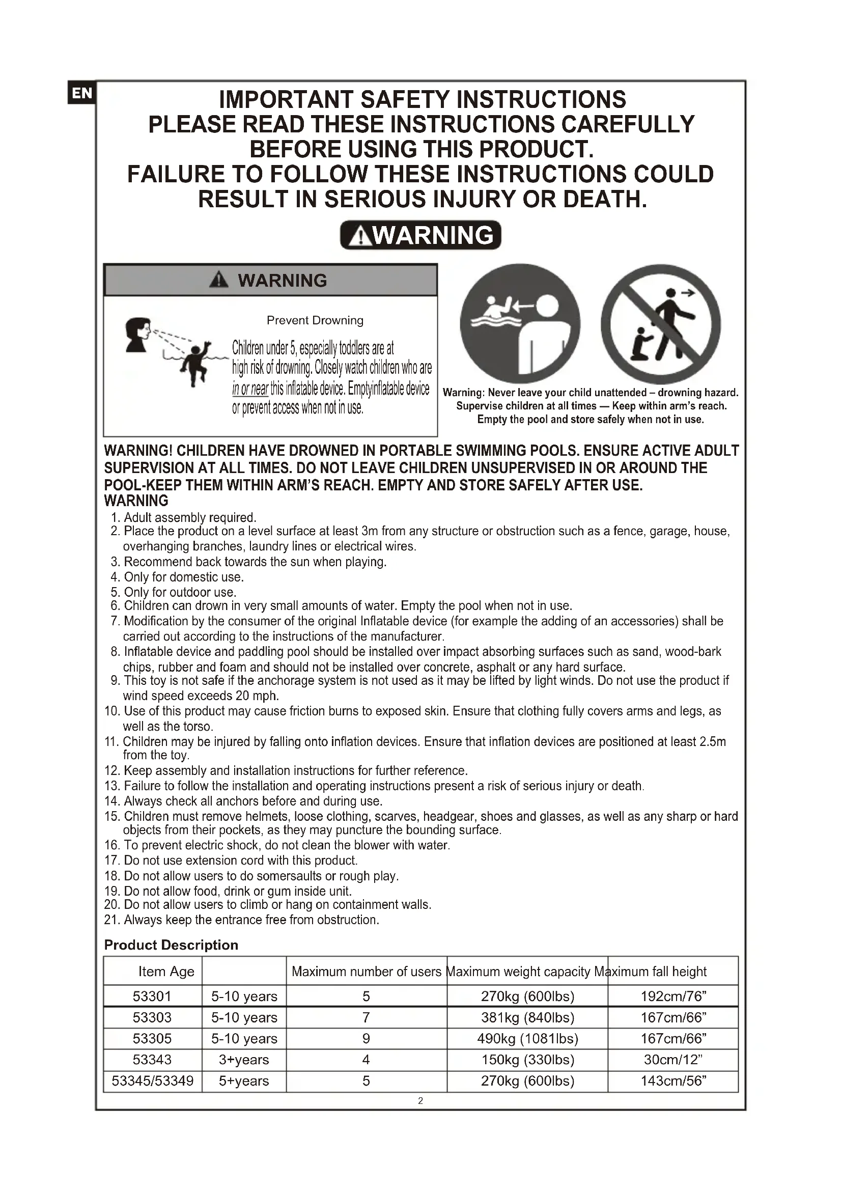 WARNING! CHILDREN HAVE DROWNED IN PORTABLE SWIMMING POOLS. ENSURE ACTIVE ADULT SUPERVISION AT ALL TIMES. DO NOT LEAVE CHILDREN UNSUPERVISED IN OR AROUND THE POOL-KEEP THEM WITHIN ARM’S REACH. EMPTY AND STORE SAFELY AFTER USE. WARNING 1. Adult assembly required. 2. Place the product on a level surface at least 3m from any structure or obstruction such as a fence, garage, house, overhanging branches, laundry lines or electrical wires. 3. Recommend back towards the sun when playing. 4. Only for domestic use. 5. Only for outdoor use. 6. Children can drown in very small amounts of water. Empty the pool when not in use. 7. Modification by the consumer of the original Inflatable device (for example the adding of an accessories) shall be carried out according to the instructions of the manufacturer. 8. Inflatable device and paddling pool should be installed over impact absorbing surfaces such as sand, wood-bark chips, rubber and foam and should not be installed over concrete, asphalt or any hard surface. 9. This toy is not safe if the anchorage system is not used as it may be lifted by light winds. Do not use the product if wind speed exceeds 20 mph.10. Use of this product may cause friction burns to exposed skin. Ensure that clothing fully covers arms and legs, as well as the torso. 11. Children may be injured by falling onto inflation devices. Ensure that inflation devices are positioned at least 2.5m from the toy.12. Keep assembly and installation instructions for further reference.
