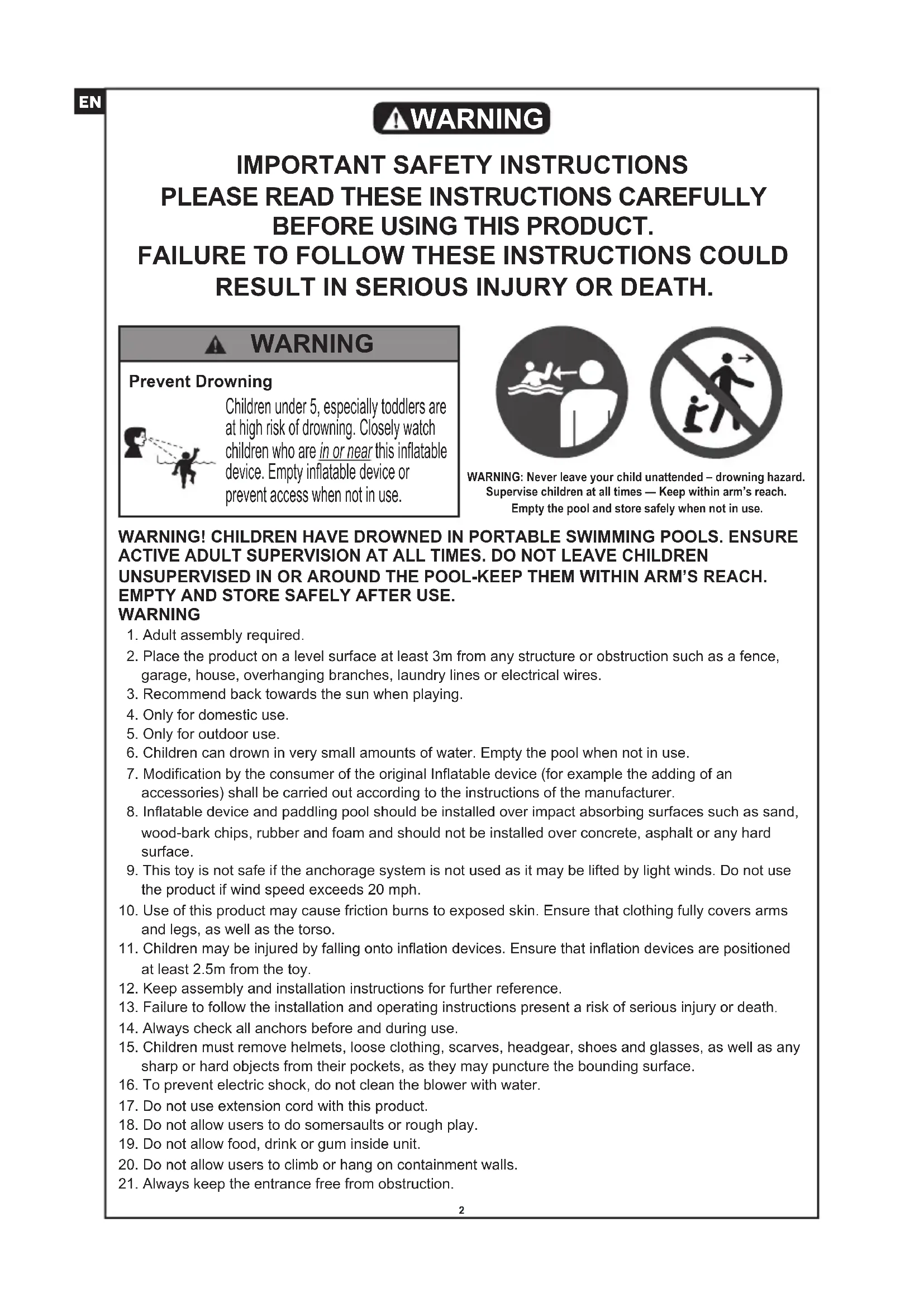 14. Always check all anchors before and during use. 15. Children must remove helmets, loose clothing, scarves, headgear, shoes and glasses, as well as any sharp or hard objects from their pockets, as they may puncture the bounding surface. 16. To prevent electric shock, do not clean the blower with water.17. Do not use extension cord with this product.18. Do not allow users to do somersaults or rough play.19. Do not allow food, drink or gum inside unit.20. Do not allow users to climb or hang on containment walls.21. Always keep the entrance free from obstruction. WARNING Prevent Drowning Children under 5, especially toddlers are at high risk of drowning. Closely watch children who are in or near this inflatable device. Empty inflatable device or prevent access when not in use. WARNING WARNING: Never leave your child unattended – drowning hazard.Supervise children at all times — Keep within arm’s reach.Empty the pool and store safely when not in use.