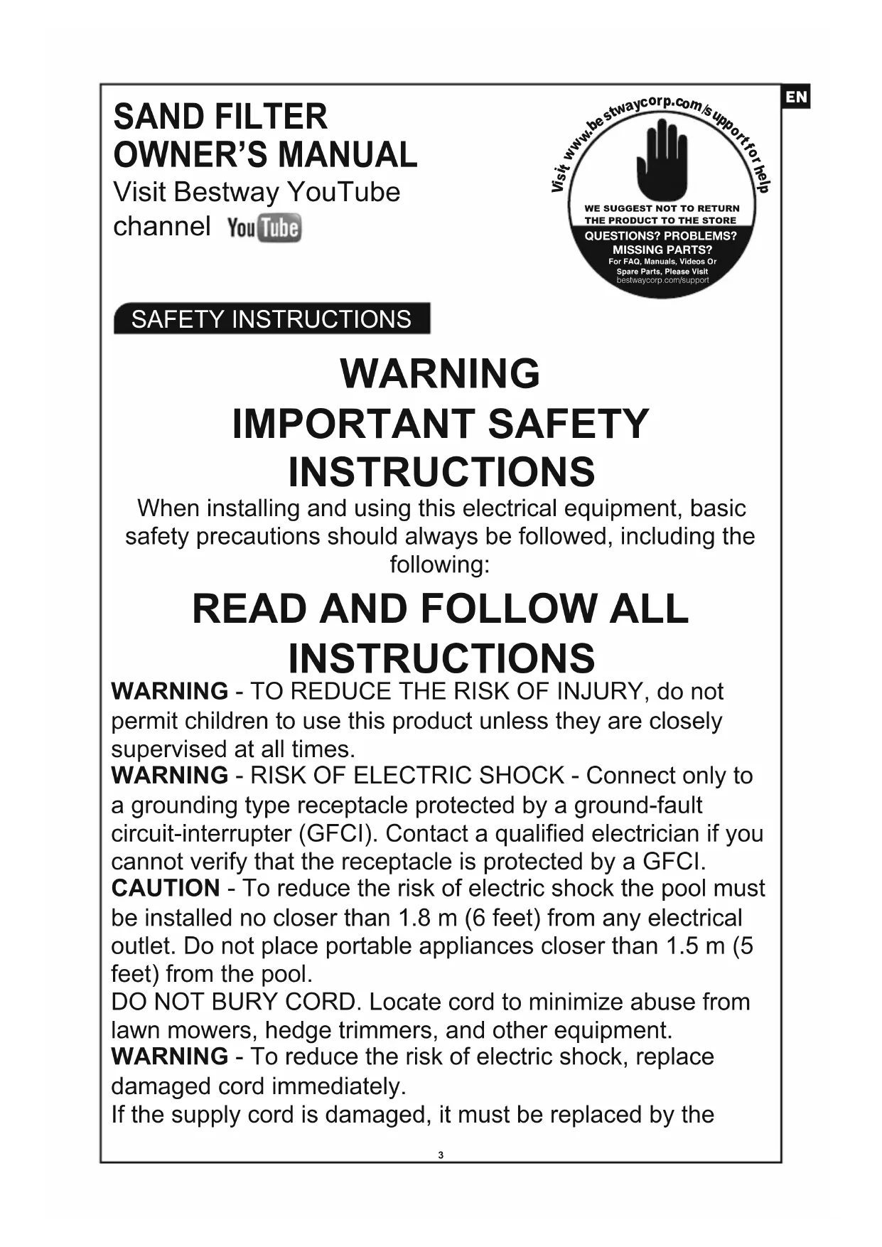 INSTRUCTIONS WARNING - TO REDUCE THE RISK OF INJURY, do not permit children to use this product unless they are closely supervised at all times. WARNING - RISK OF ELECTRIC SHOCK - Connect only to a grounding type receptacle protected by a ground-fault circuit-interrupter (GFCI). Contact a qualified electrician if you cannot verify that the receptacle is protected by a GFCI. CAUTION - To reduce the risk of electric shock the pool must be installed no closer than 1.8 m (6 feet) from any electrical outlet. Do not place portable appliances closer than 1.5 m (5 feet) from the pool. DO NOT BURY CORD. Locate cord to minimize abuse from lawn mowers, hedge trimmers, and other equipment. WARNING - To reduce the risk of electric shock, replace damaged cord immediately. If the supply cord is damaged, it must be replaced by the manufacturer, its service agent or similarly qualified persons in order to avoid a hazard. WARNING - To reduce the risk of electric shock, do not use extension cord to connect unit to electric supply; provide a properly located outlet. CAUTION: This pump is for use with storable pools only. Do not use with permanently-installed pools. A storable pool is constructed so that it is capable of being readily disassembled for storage and reassembled to its original integrity. A permanently-installed pool is constructed in or on the ground or in a building such that it cannot be readily disassembled for storage. WARNING - This appliance is not intended for use by persons (including children) with reduced physical, sensory or mental capabilities, or lack of experience and knowledge, unless they have been given supervision or instruction concerning use of the appliance by a person responsible for their safety. Children should be supervised to ensure that they do not play with the appliance. Electric installations should follow national wiring rules, consult a qualified electrician with any questions. The pump is to be supplied by an isolating transformer or supplied through a residual current device (RCD) having a rated residual operating current not exceeding 30 mA. Please examine and verify all sand filter components are present before use. Notify Bestway at the customer service address listed on this manual for any damaged or missing parts at the time of purchase.
