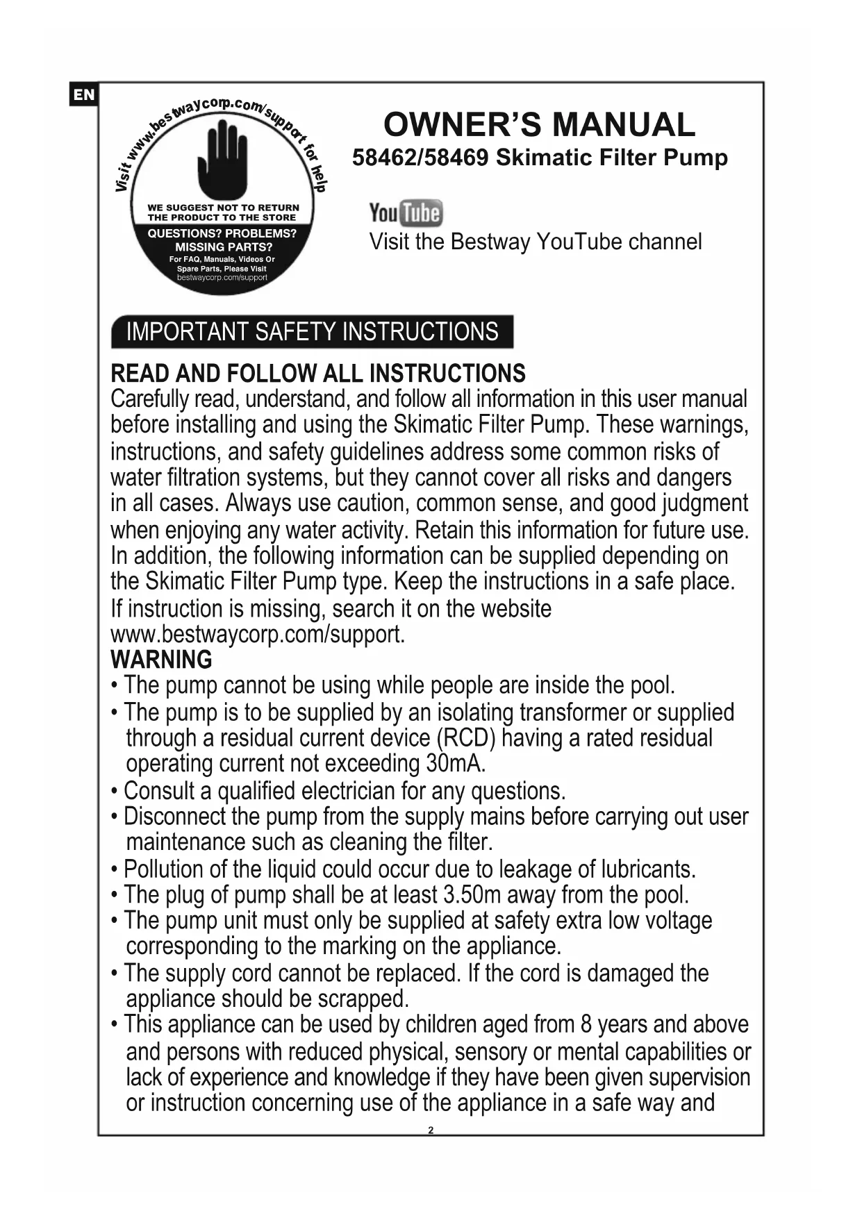 58462/58469 Skimatic Filter Pump WE SUGGEST NOT TO RETURNTHE PRODUCT TO THE STOREQUESTIONS? PROBLEMS?MISSING PARTS? For FAQ, Manuals, Videos Or Spare Parts, Please Visitbestwaycorp.com/support