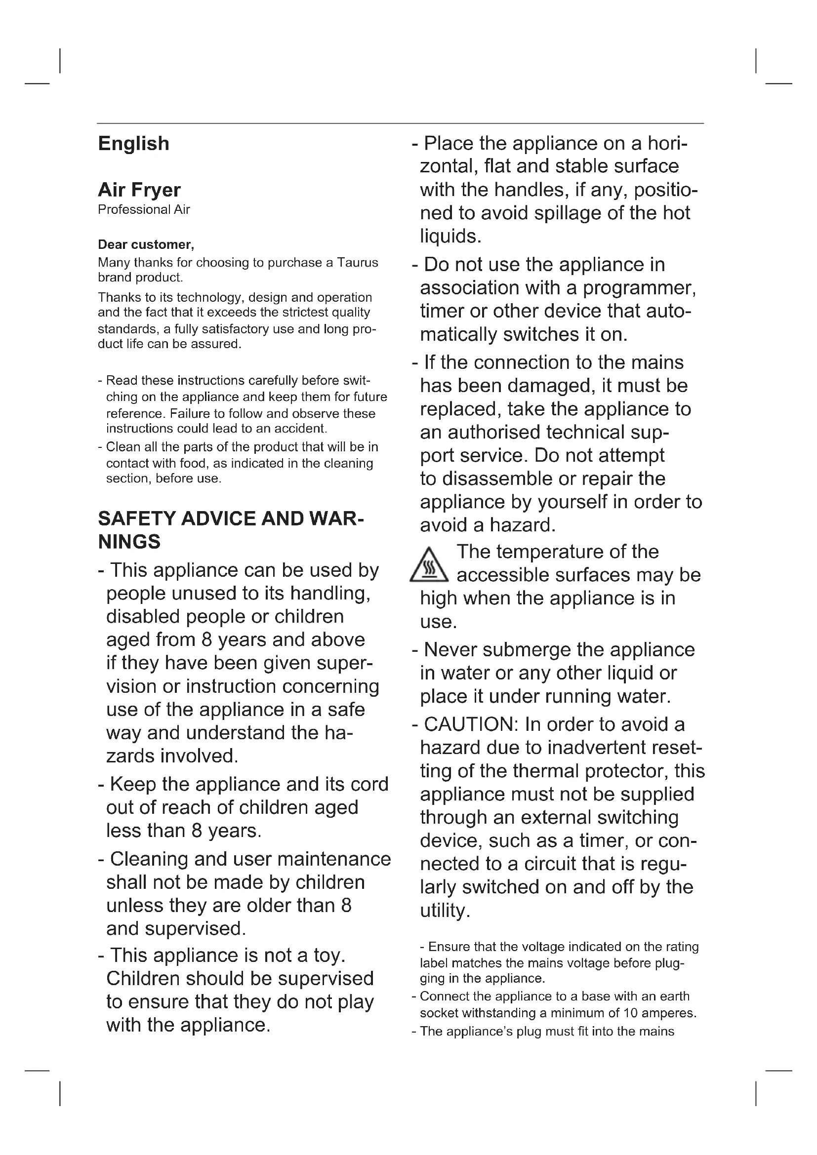- NOTA: Para freír en la freidora de Aire Profes- sional Air, es mejor usar ingredientes preparados para horno.English Air Fryer Professional Air Dear customer, Many thanks for choosing to purchase a Taurus brand product. Thanks to its technology, design and operation and the fact that it exceeds the strictest quality standards, a fully satisfactory use and long pro- duct life can be assured. - Read these instructions carefully before swit- ching on the appliance and keep them for future reference. Failure to follow and observe these instructions could lead to an accident. - Clean all the parts of the product that will be in contact with food, as indicated in the cleaning section, before use.