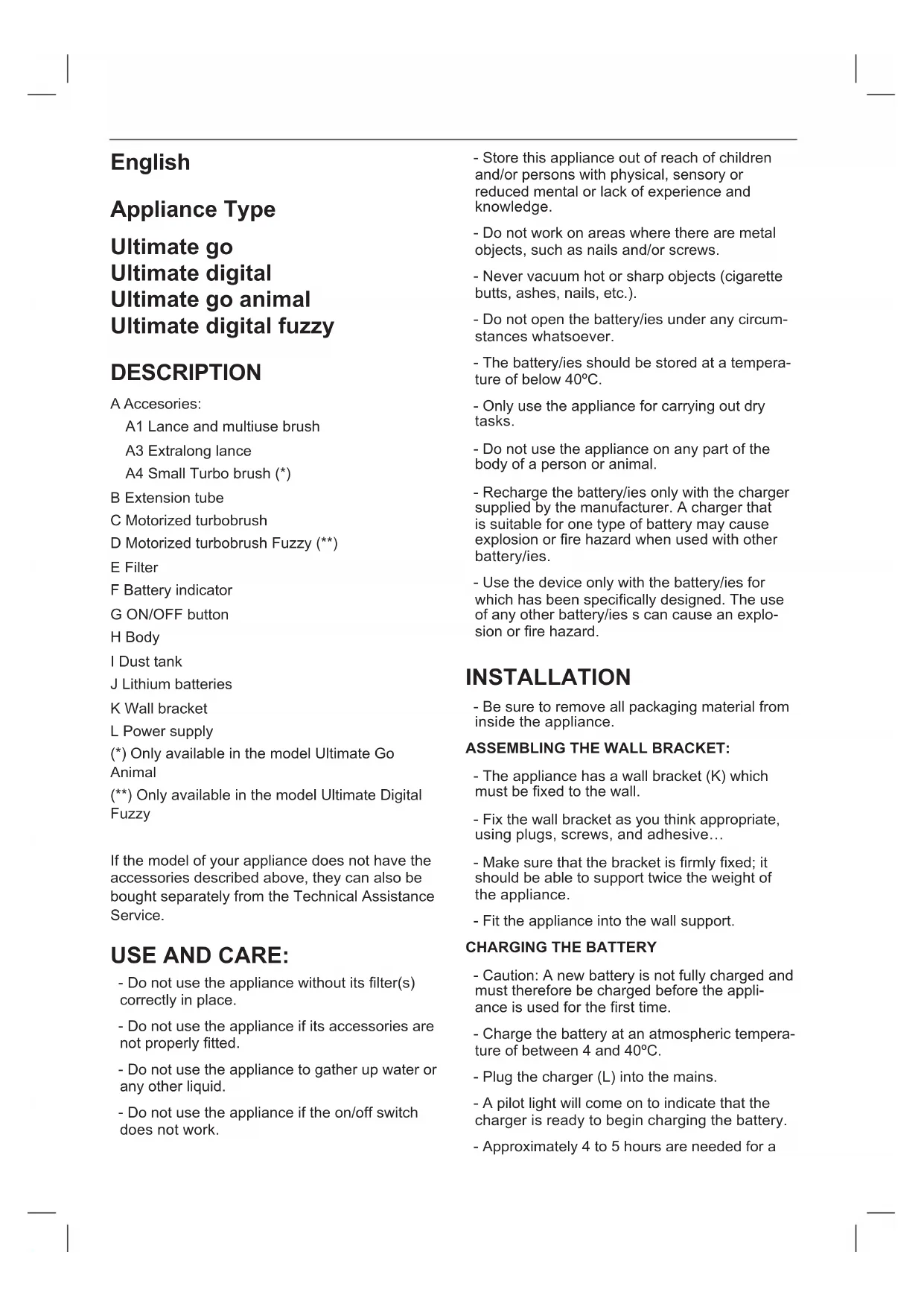 - Caution: A new battery is not fully charged and must therefore be charged before the appli- ance is used for the rst time. - Charge the battery at an atmospheric tempera- ture of between 4 and 40ºC. - Plug the charger (L) into the mains. - A pilot light will come on to indicate that the charger is ready to begin charging the battery. - Approximately 4 to 5 hours are needed for acomplete charge of the battery. Never attempt to over-charge the battery (although it is rec- ommended that the rst charge of the battery be of 6 hours in duration). - Insert the battery into the charger. - Connect the charger (L) to the jack using the socket on the appliance. The socket is located at the lower/back part of the appliance. - The pilot light will come on to indicate that the charger is charging the battery. - At the end of the time period specied above, remove the battery from the charger. - When the battery is charged disconnect the charger from the mains supply. - NB: Do not use the appliance while it is con- nected to the charger. HOW TO CHECK THE BATTERY’S CHARGE LEVEL: - Press the ON/OFF button in order to see the battery indicator lights. - If no pilot light lights up, this means that the battery is completely at. - NB: For a long battery life, it is advisable to charge the battery, only, when it has run out completely.
