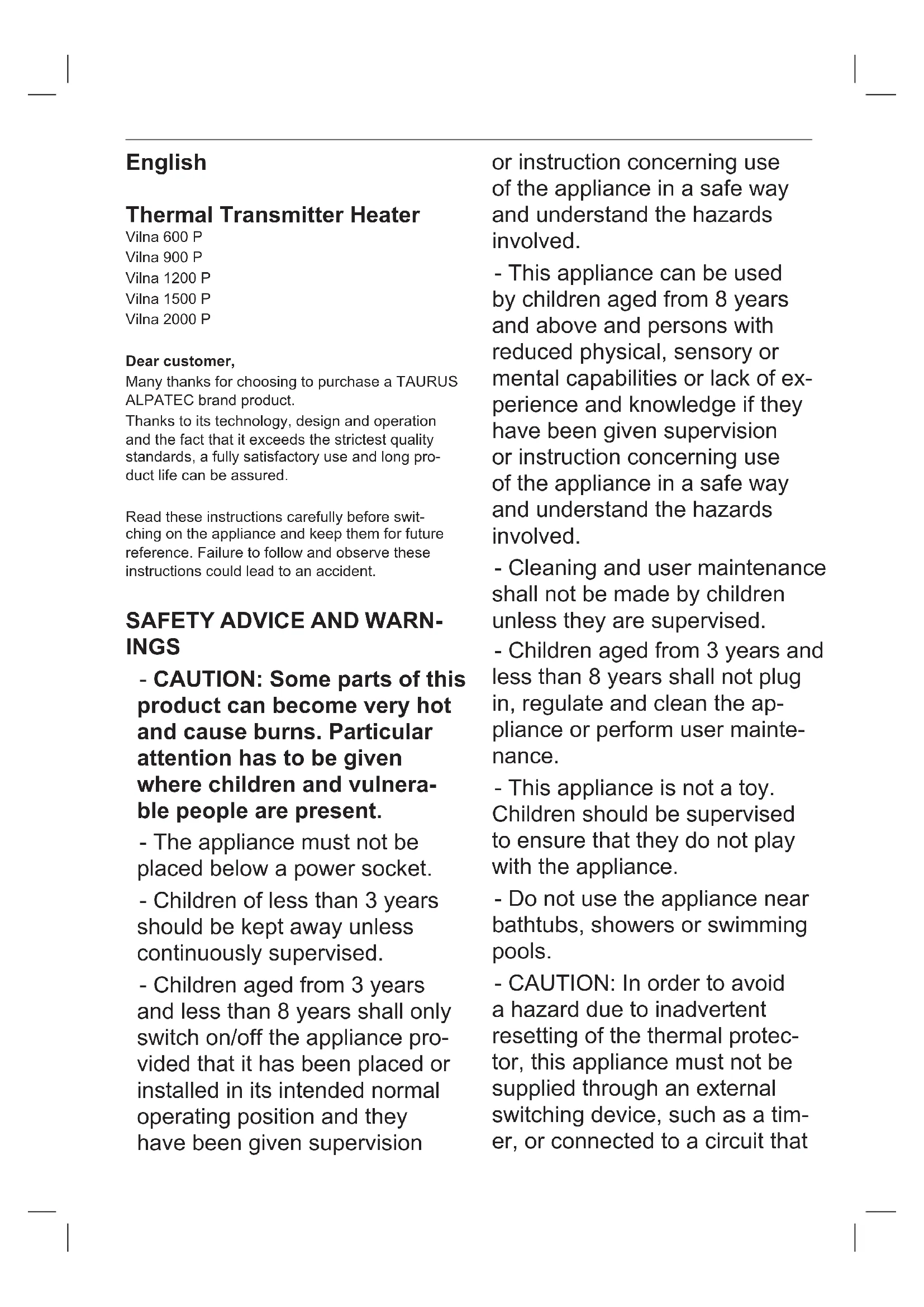 Vilna 1500 P - Heating TAURUS - Free user manual and instructions