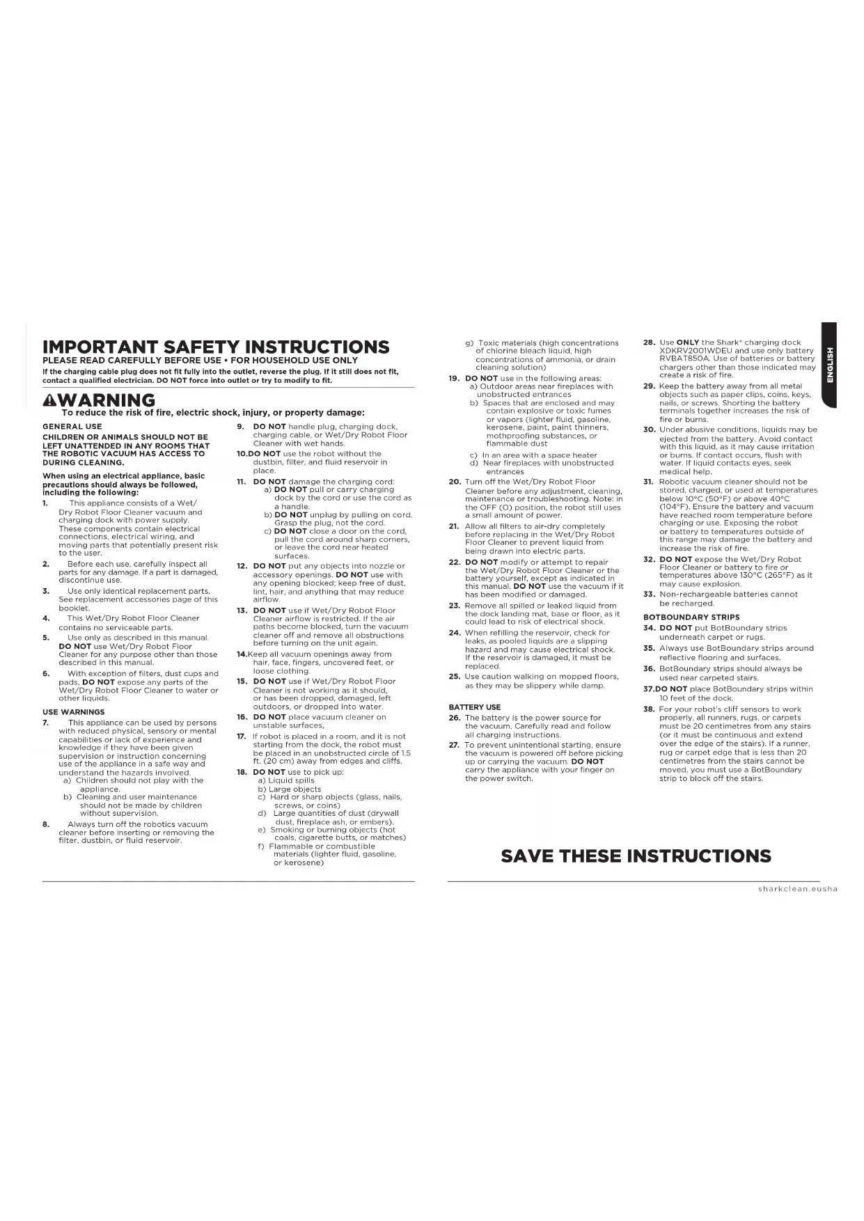 pads, DO NOT expose any parts of the Wet/Dry Robot Floor Cleaner to water or other liquids. USE WARNINGS