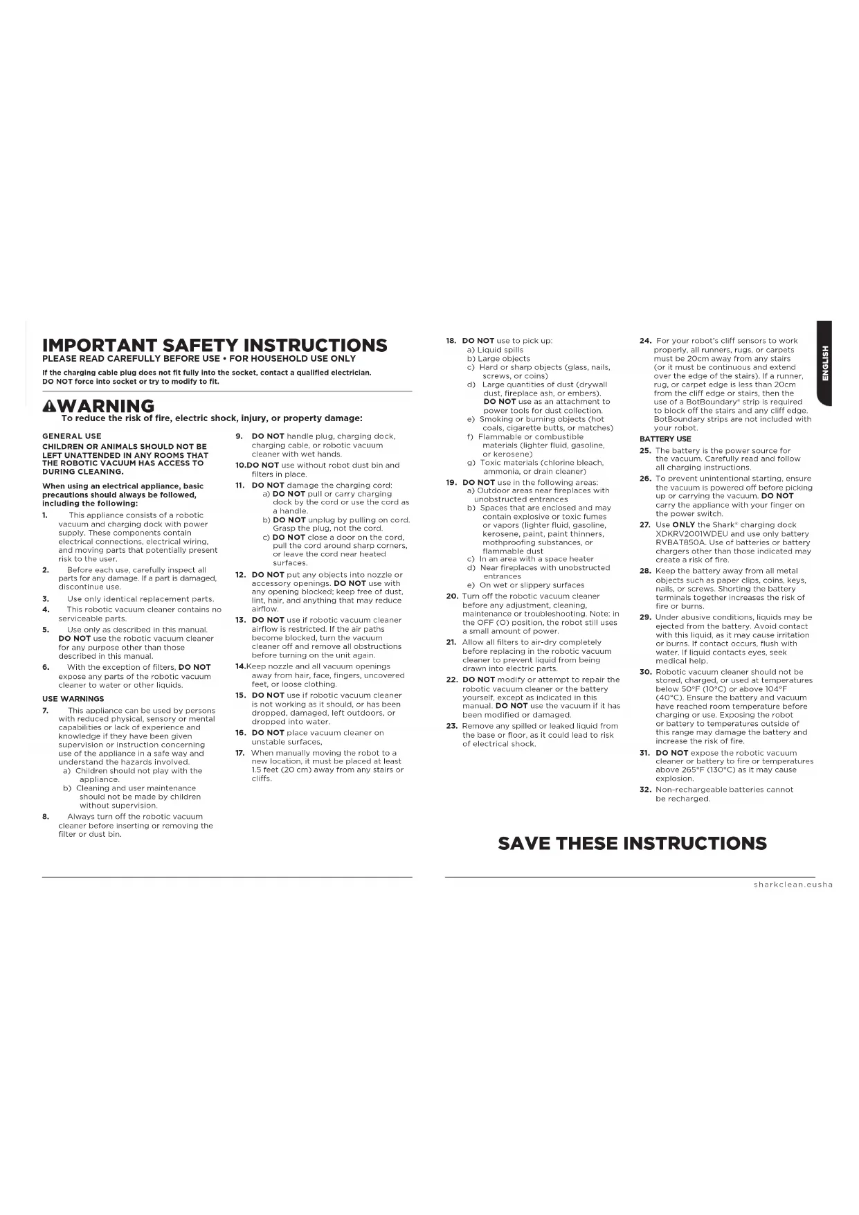 ROBOT & DOCK While your robot is cleaning, do not pick it up and move it, or move the charging dock— this will impact the robot’s navigation and ability to return to dock when cleaning is complete. STAIRS Your robot’s cli sensors will prevent it from falling o ledges. For the cli sensors to work properly in any mode, all runners, rugs, or carpets must be at least 20cm from any stairs, or must extend over the edge of the stairs. ENGLISHsharkclean.eusharkclean.eu